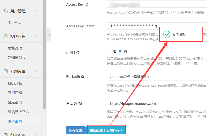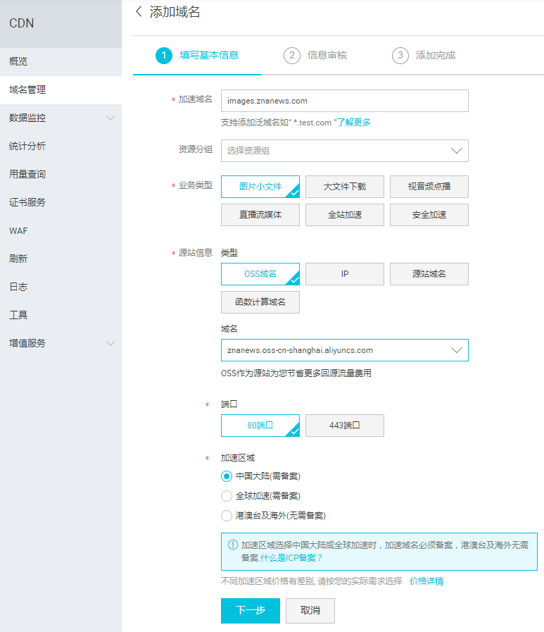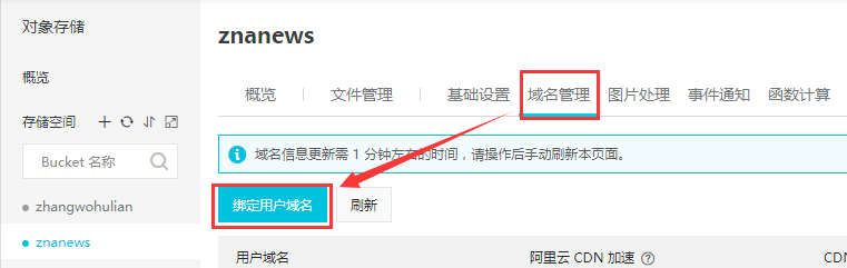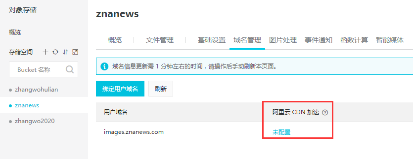 ## 阿里云OSS配置 一、登录阿里云账号,进入控制面板,打开“对象存储OSS”  二、点击页面左上角的新建按钮,新建存储空间  三、填写Bucket名称,读写权限那里选择“公共读”,然后“确定”提交  四、选择刚创建的Bucket,点击对应的“域名管理”,绑定用户域名,  五、这里我们以images.znanews.com为例,选择“自动添加CNAME记录”,然后确认提交 ##此账号拥有该域名的管理权限,故选择“自动添加CNAME记录”,如果域名不在当前账号下需要根据提示手动添加相关域名解析  六、配置阿里云CDN加速  七、添加CDN加速域名页面所有信息默认即可,直接下一步提交  八、开启https(也可以不开启)  九、在后台填写OSS相关的key ID和KEY Secret,选择Bucket,以及配置好的域名