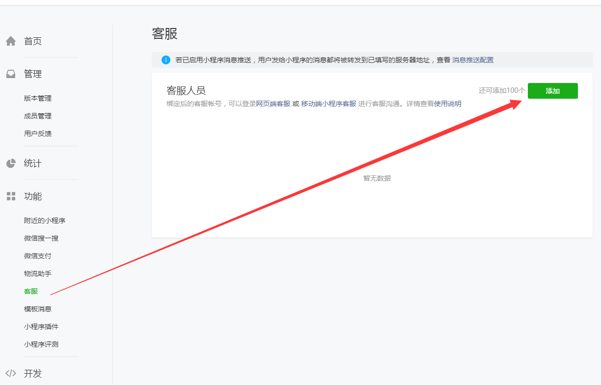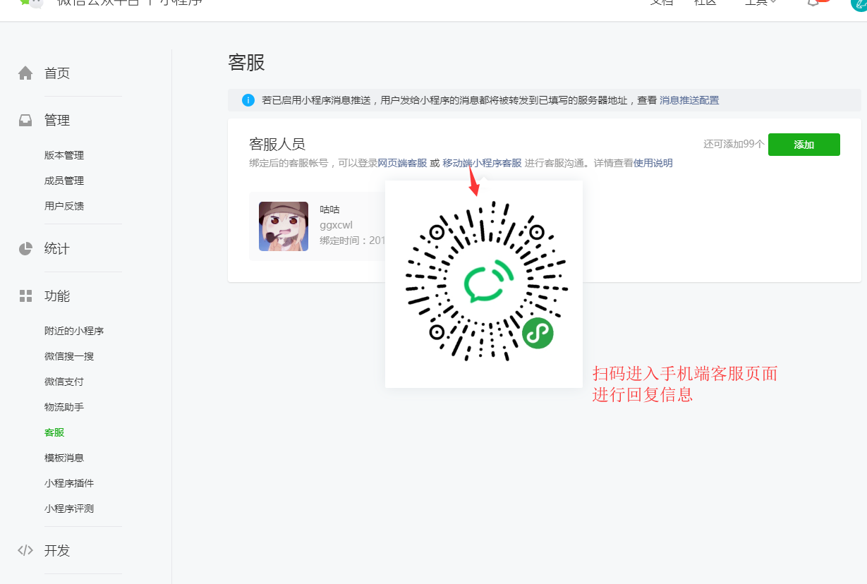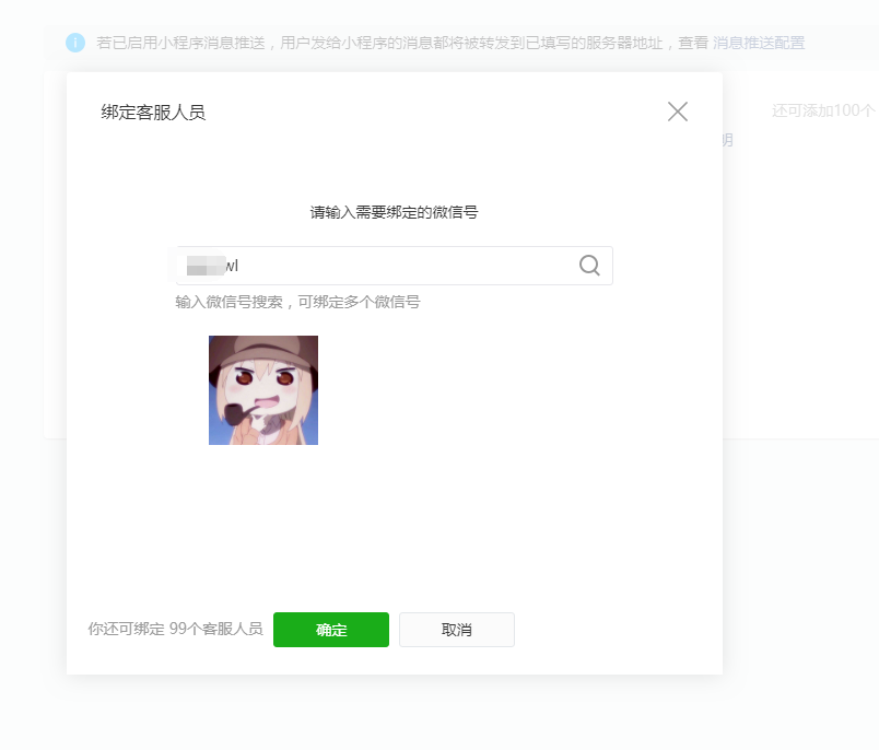 ### 客服配置 现在直接可以用小程序的官方客服 后台的客服可以不用配置 消息推送需要关闭 #### 绑定小程序官方客服操作:  #### 添加客服人员    #### 关闭消息推送