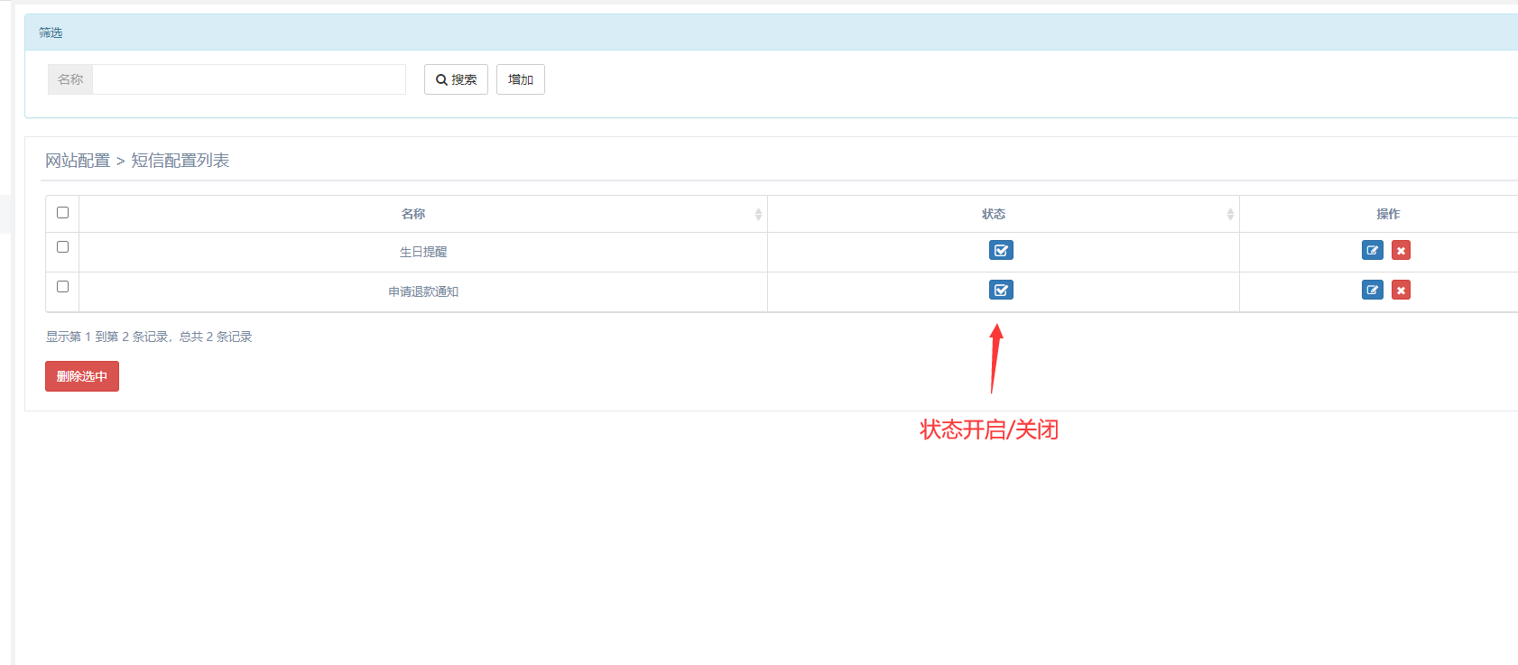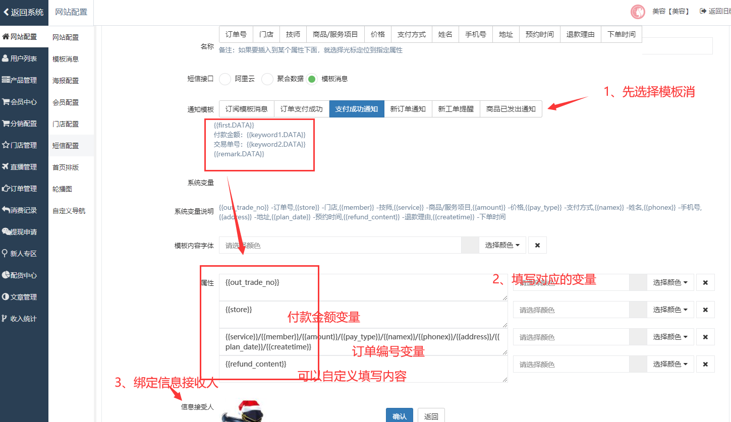 ### 短信配置 这边的短信配置是自定义添加的 支持短信通知和模板消息通知 如:生日提醒的通知和申请退款的通知 都是在这边添加  ### 新增短信 支持阿里云短信和聚合数据还有模板消息div 阿里云:  ### 模板消息div