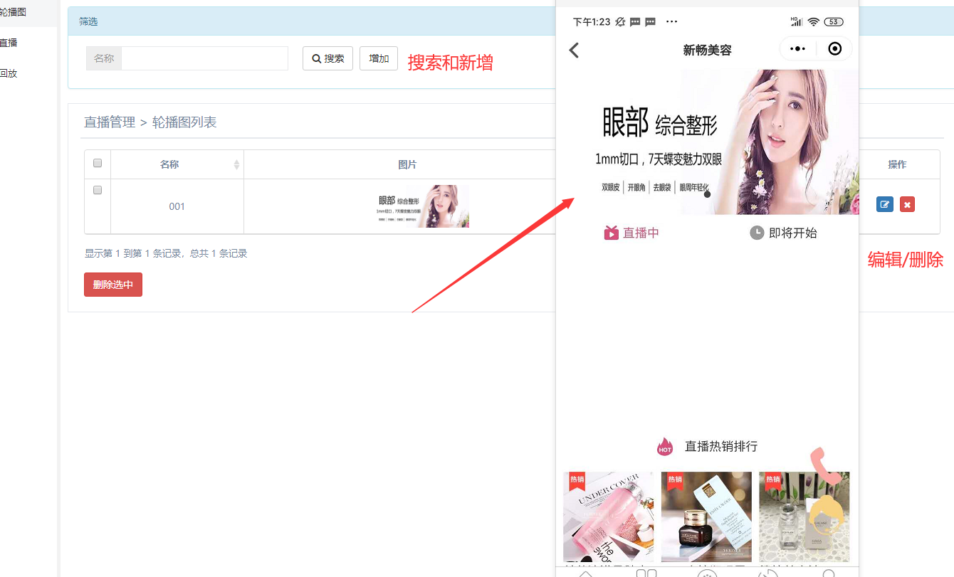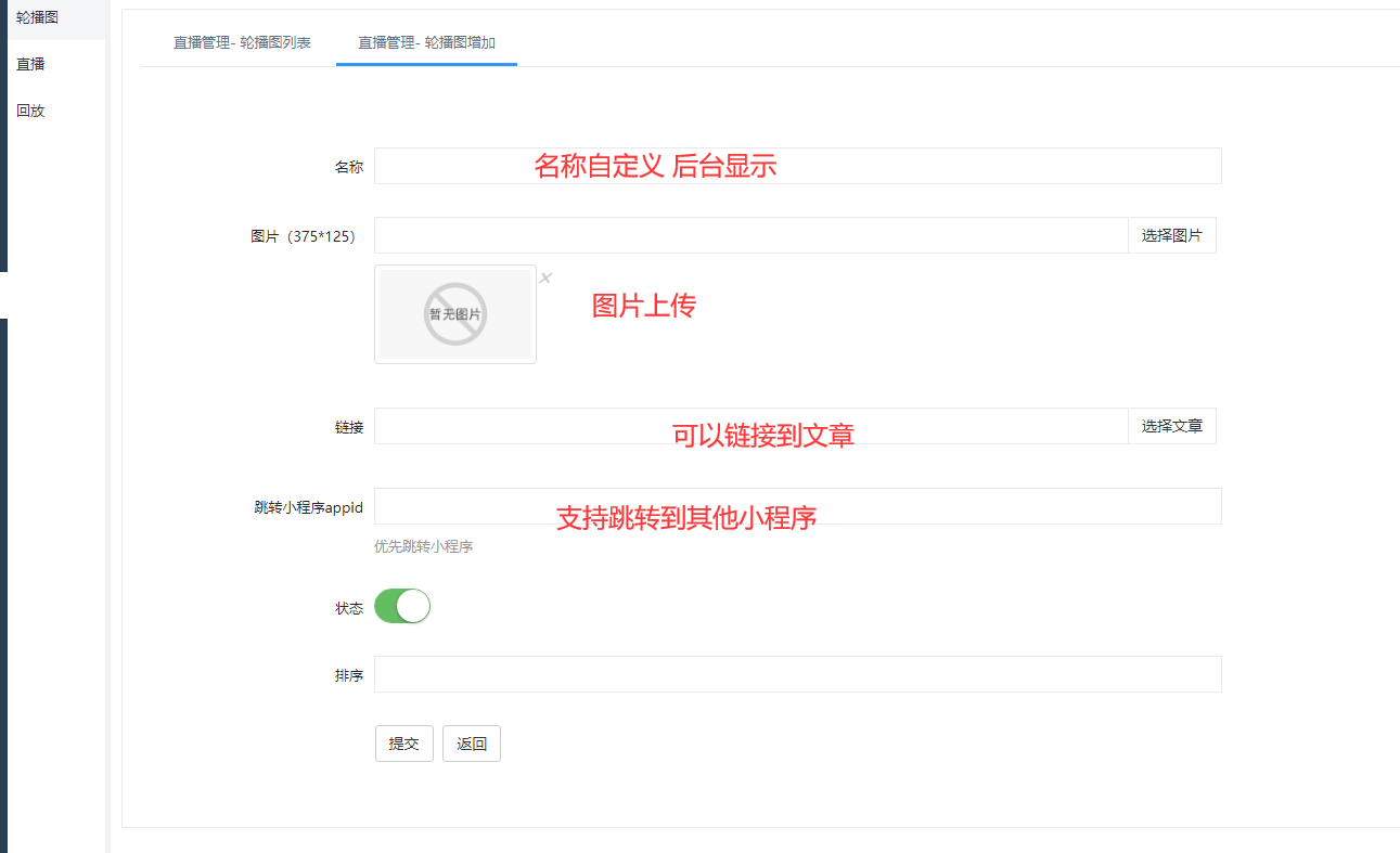 ### 轮播图 ##### 在直播列表页面显示  #### 新增轮播图