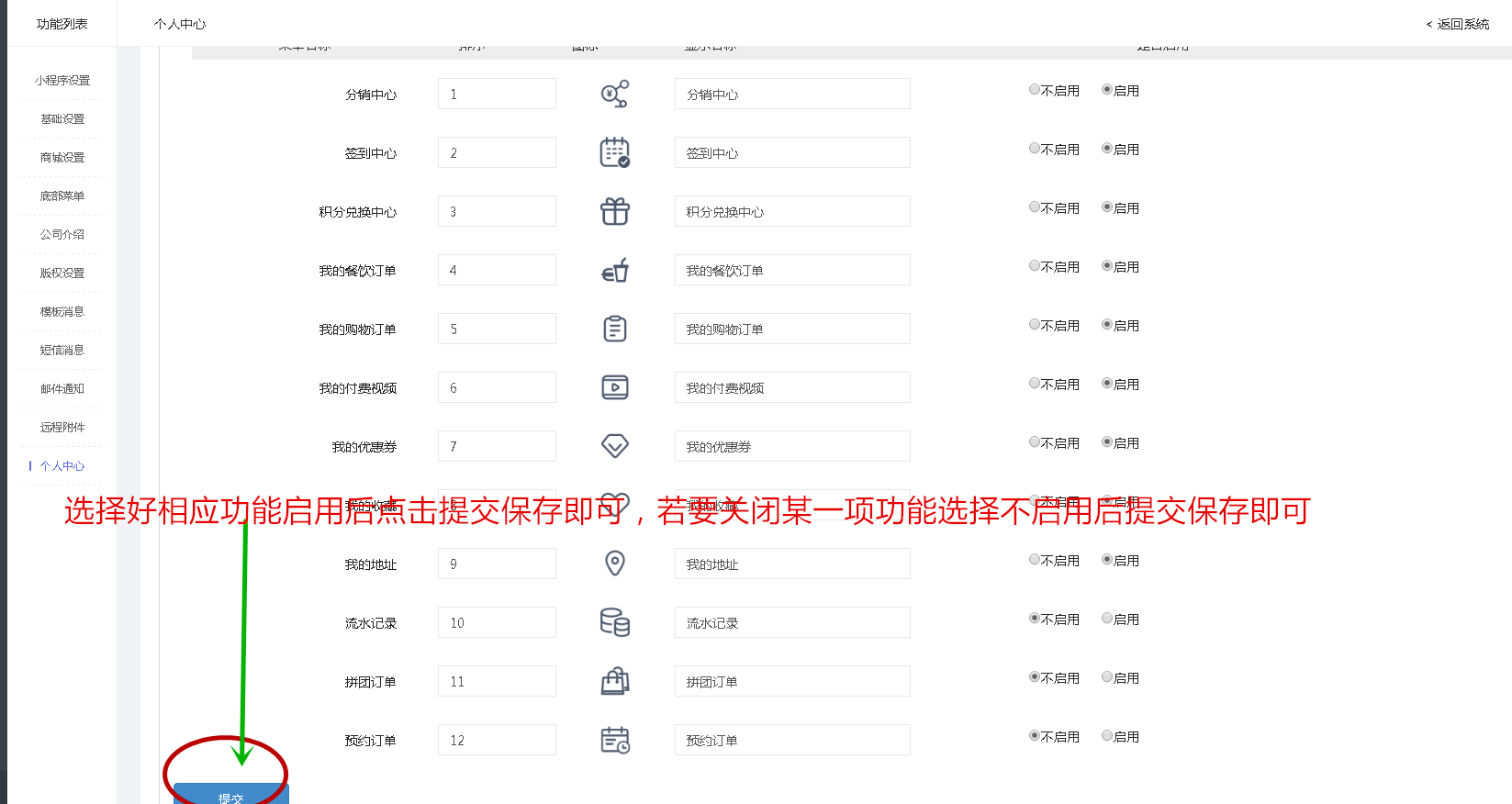 点开系统里的个人中心后看到如下图所示界面,选择相应的功能点击启用后提交保存即可