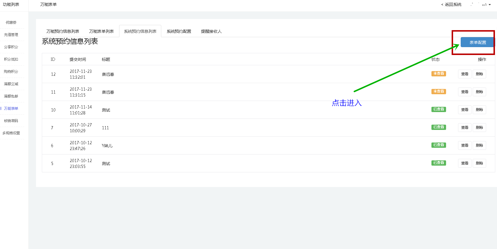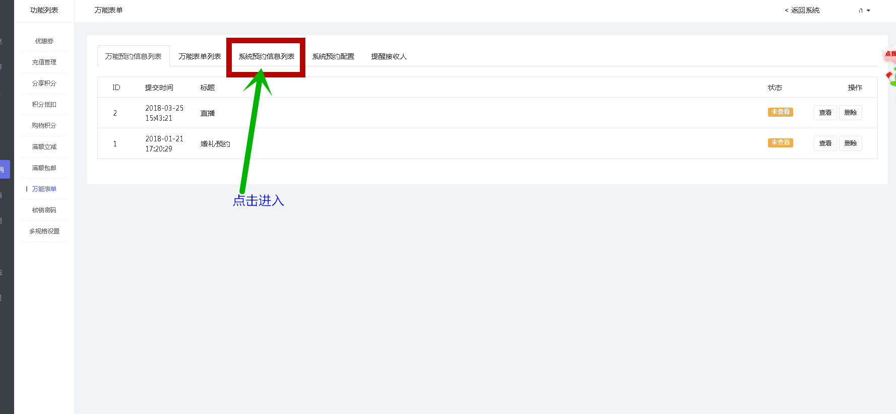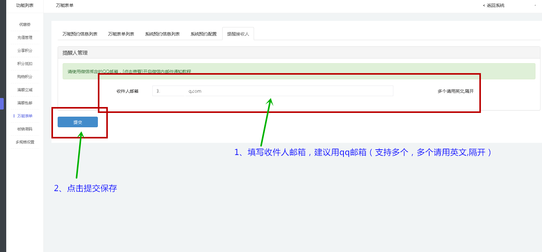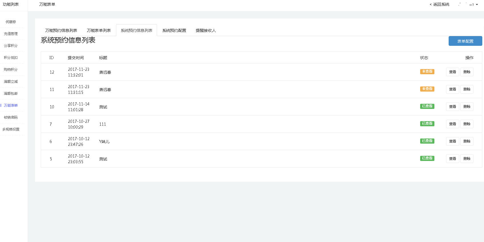 1、万能预约信息列表 2、万能表单列表 3、系统预约信息列表 4、系统预约配置 5、提醒接受人 ###1.万能预约信息列表 打开营销功能下的万能表单进入如下图所示的万能预约信息列表,对预约信息进行查看和处理  ###2.万能表单列表 添加和管理万能表单 一、打开营销功能下的万能表单进入如下图一所示界面并点击万能表单列表进入如下图二所示列表万能表单界面(注:编辑和删除是对表单进行管理)  图一  图二 二、点击上一步中图二(及下图一)所示的的添加万能表单进入万能表单设计页面,如下图二所示,并根据图中标注填写信息后设计好表单后提交保存完成万能表单添加  图一  图二 ###3.系统预约信息列表 系统预约信息的管理以及系统预约表单配置 一、点击营销功能下的万能表单进入如下图一所示界面,点击系统预约信息列表后进入如图二所示界面(可以查看预约信息,删除预约信息,以及表单配置)  图一  图二 二、在下图一(即上一步中图二)所示界面点击表单配置进入表单设置页面,如下图二所示,并根据图示标注完成表单设置信息填写后提交保存及完成表单配置  图一  图二 ###4.系统预约配置 参考系统预约信息列表表中第二点即可(上面已经写了,这里就不再重复了) ###5.提醒接受人 一、点击营销中的万能表单进入如下图一所示界面,点击提醒接受人进入设置界面,如下图二所示,并根据图示标注填写信息后提交保存即可完成设置  图一  图二 二、开启微信内邮件通知 微信可以绑定邮箱,从而不用登陆邮箱,当用户发送邮件的时候,会自动显示到微信聊天信息上面。比较快捷方便省事。 1、登陆微信账号,找到设置,下图是QQ邮箱提醒  2、进入设置页面,找到【通用】【功能】  3、我的QQ邮箱为开启状态,可以解除开启状态。  4、 停用微信QQ邮箱后会清空所有之前绑定的数据。  5、 未启用的都功能在在启用功能的下边,我认为排序不咋好,来这里都是看哪些功能未启用的。  6、点击启用该功能  7、启用成功后如下图所示