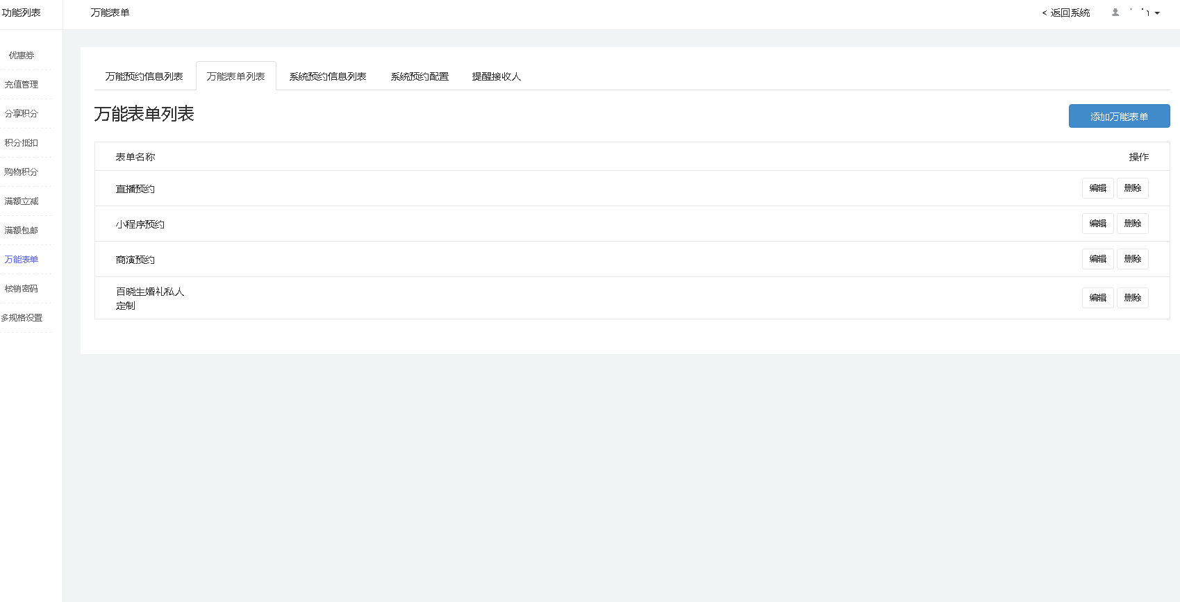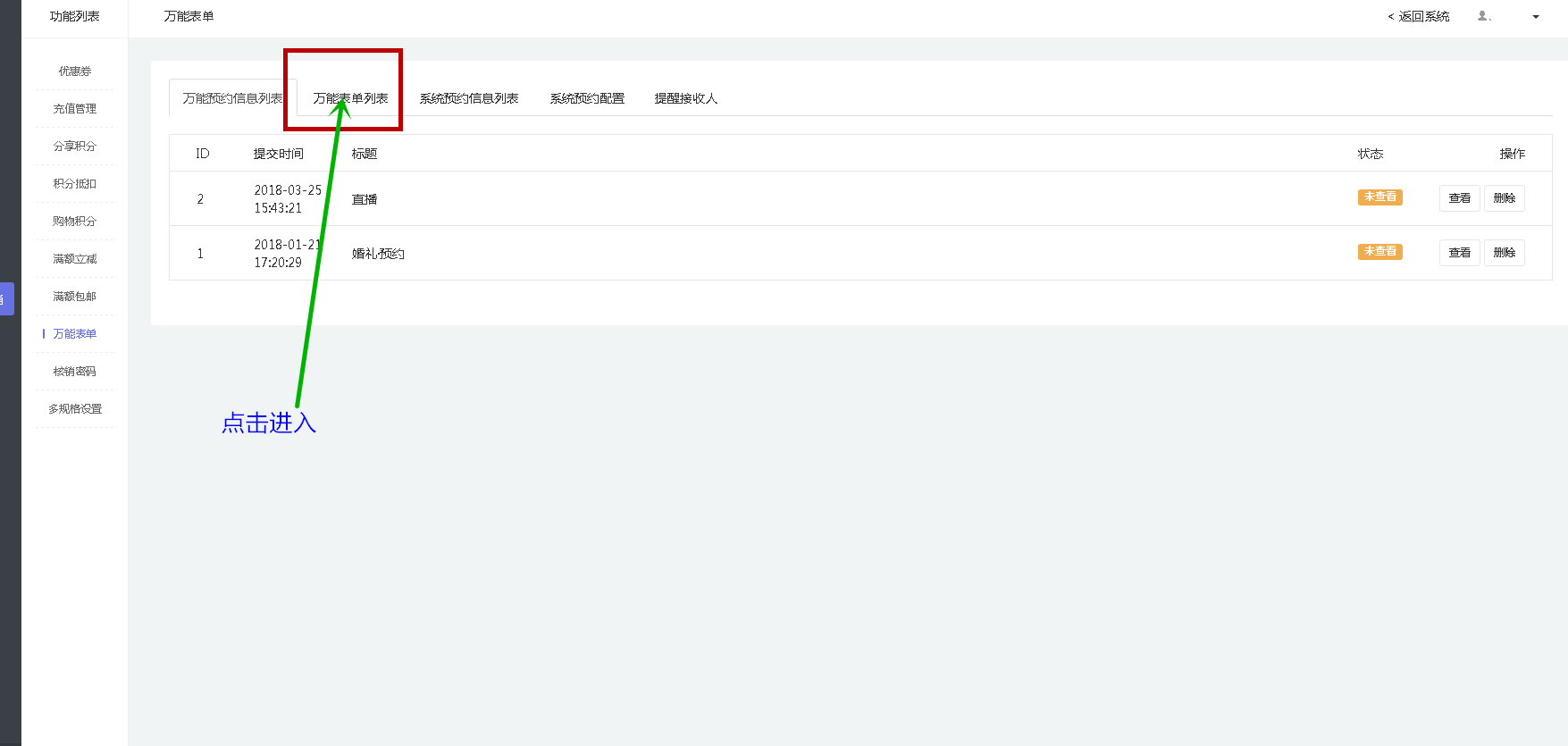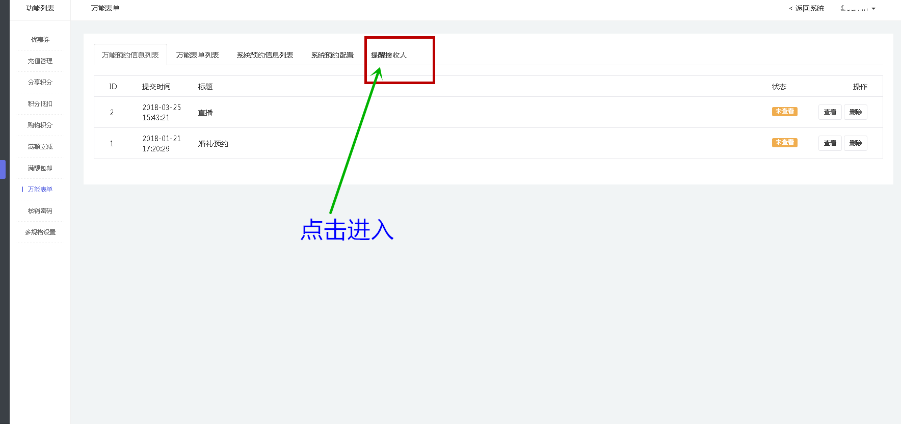 1、万能预约信息列表 2、万能表单列表 3、系统预约信息列表 4、系统预约配置 5、提醒接受人 ###1.万能预约信息列表 打开营销功能下的万能表单进入如下图所示的万能预约信息列表,对预约信息进行查看和处理  ###2.万能表单列表 添加和管理万能表单 一、打开营销功能下的万能表单进入如下图一所示界面并点击万能表单列表进入如下图二所示列表万能表单界面(注:编辑和删除是对表单进行管理)  图一  图二 二、点击上一步中图二(及下图一)所示的的添加万能表单进入万能表单设计页面,如下图二所示,并根据图中标注填写信息后设计好表单后提交保存完成万能表单添加  图一  图二 ###3.系统预约信息列表 系统预约信息的管理以及系统预约表单配置 一、点击营销功能下的万能表单进入如下图一所示界面,点击系统预约信息列表后进入如图二所示界面(可以查看预约信息,删除预约信息,以及表单配置)  图一  图二 二、在下图一(即上一步中图二)所示界面点击表单配置进入表单设置页面,如下图二所示,并根据图示标注完成表单设置信息填写后提交保存及完成表单配置  图一  图二 ###4.系统预约配置 参考系统预约信息列表表中第二点即可(上面已经写了,这里就不再重复了) ###5.提醒接受人 一、点击营销中的万能表单进入如下图一所示界面,点击提醒接受人进入设置界面,如下图二所示,并根据图示标注填写信息后提交保存即可完成设置  图一  图二 二、开启微信内邮件通知 微信可以绑定邮箱,从而不用登陆邮箱,当用户发送邮件的时候,会自动显示到微信聊天信息上面。比较快捷方便省事。 1、登陆微信账号,找到设置,下图是QQ邮箱提醒  2、进入设置页面,找到【通用】【功能】  3、我的QQ邮箱为开启状态,可以解除开启状态。  4、 停用微信QQ邮箱后会清空所有之前绑定的数据。  5、 未启用的都功能在在启用功能的下边,我认为排序不咋好,来这里都是看哪些功能未启用的。  6、点击启用该功能  7、启用成功后如下图所示