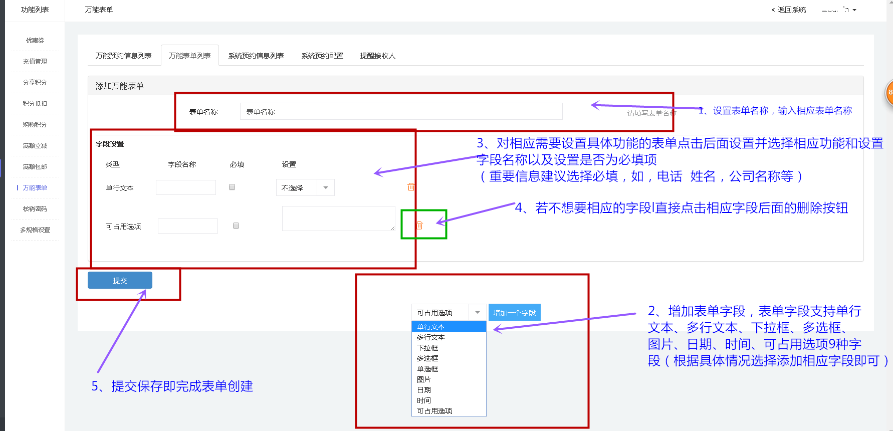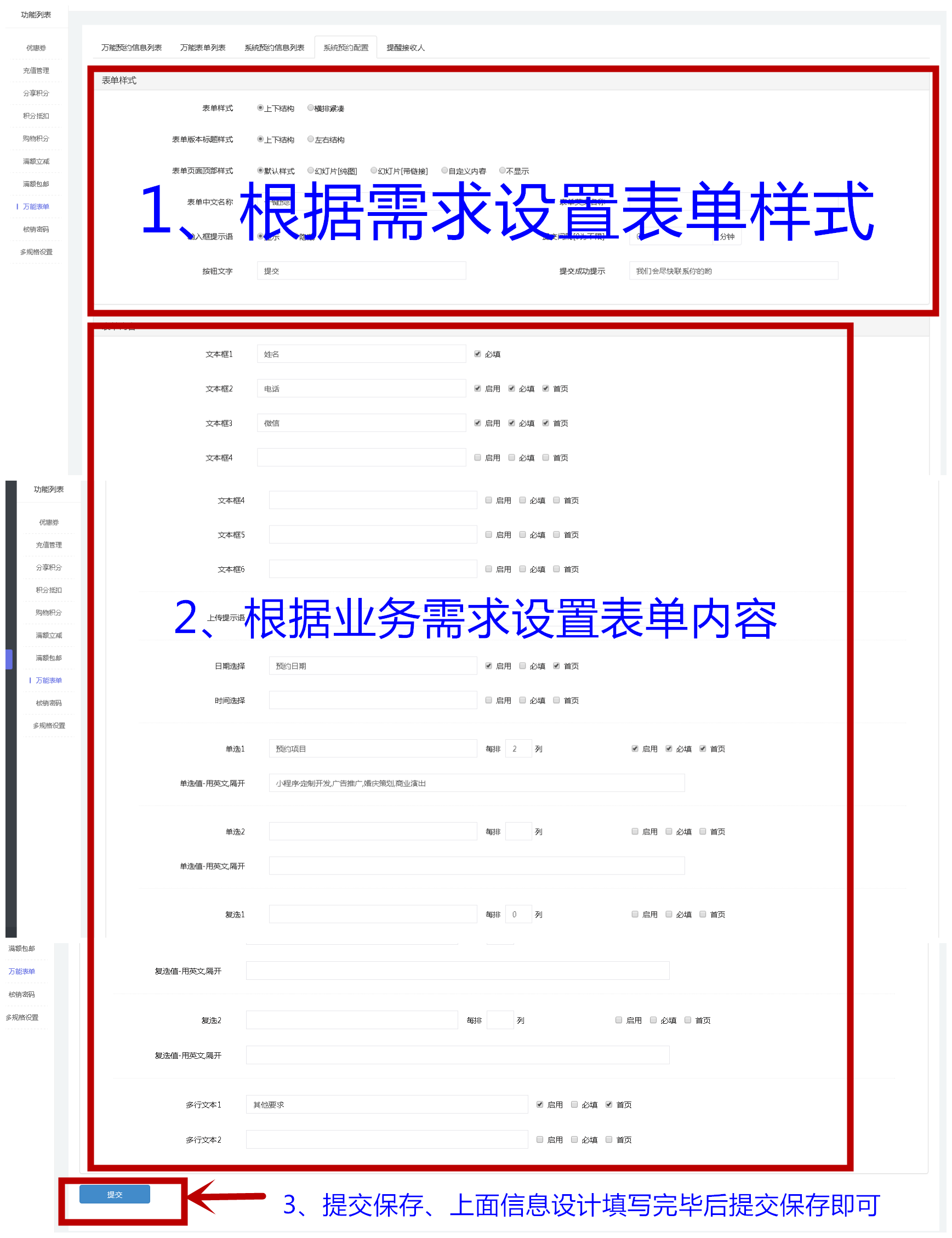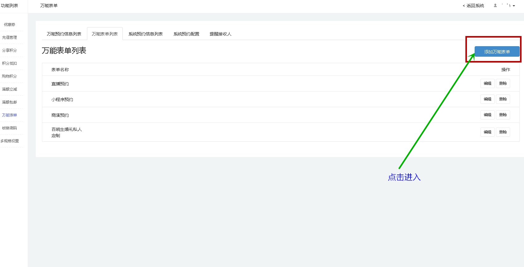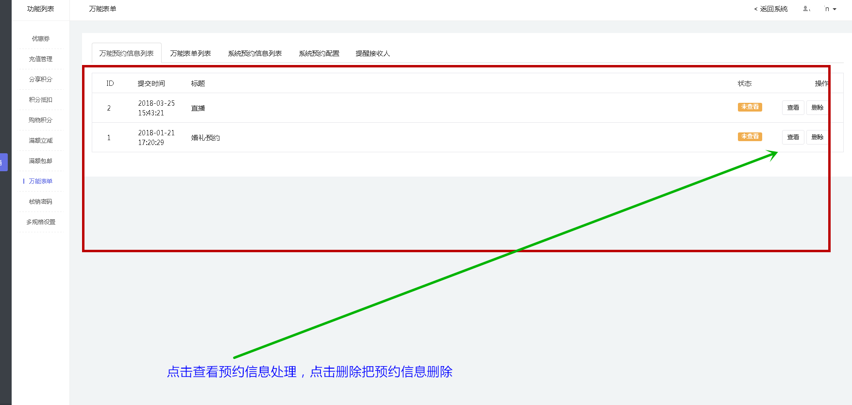 1、万能预约信息列表 2、万能表单列表 3、系统预约信息列表 4、系统预约配置 5、提醒接受人 ###1.万能预约信息列表 打开营销功能下的万能表单进入如下图所示的万能预约信息列表,对预约信息进行查看和处理  ###2.万能表单列表 添加和管理万能表单 一、打开营销功能下的万能表单进入如下图一所示界面并点击万能表单列表进入如下图二所示列表万能表单界面(注:编辑和删除是对表单进行管理)  图一  图二 二、点击上一步中图二(及下图一)所示的的添加万能表单进入万能表单设计页面,如下图二所示,并根据图中标注填写信息后设计好表单后提交保存完成万能表单添加  图一  图二 ###3.系统预约信息列表 系统预约信息的管理以及系统预约表单配置 一、点击营销功能下的万能表单进入如下图一所示界面,点击系统预约信息列表后进入如图二所示界面(可以查看预约信息,删除预约信息,以及表单配置)  图一  图二 二、在下图一(即上一步中图二)所示界面点击表单配置进入表单设置页面,如下图二所示,并根据图示标注完成表单设置信息填写后提交保存及完成表单配置  图一  图二 ###4.系统预约配置 参考系统预约信息列表表中第二点即可(上面已经写了,这里就不再重复了) ###5.提醒接受人 一、点击营销中的万能表单进入如下图一所示界面,点击提醒接受人进入设置界面,如下图二所示,并根据图示标注填写信息后提交保存即可完成设置  图一  图二 二、开启微信内邮件通知 微信可以绑定邮箱,从而不用登陆邮箱,当用户发送邮件的时候,会自动显示到微信聊天信息上面。比较快捷方便省事。 1、登陆微信账号,找到设置,下图是QQ邮箱提醒  2、进入设置页面,找到【通用】【功能】  3、我的QQ邮箱为开启状态,可以解除开启状态。  4、 停用微信QQ邮箱后会清空所有之前绑定的数据。  5、 未启用的都功能在在启用功能的下边,我认为排序不咋好,来这里都是看哪些功能未启用的。  6、点击启用该功能  7、启用成功后如下图所示