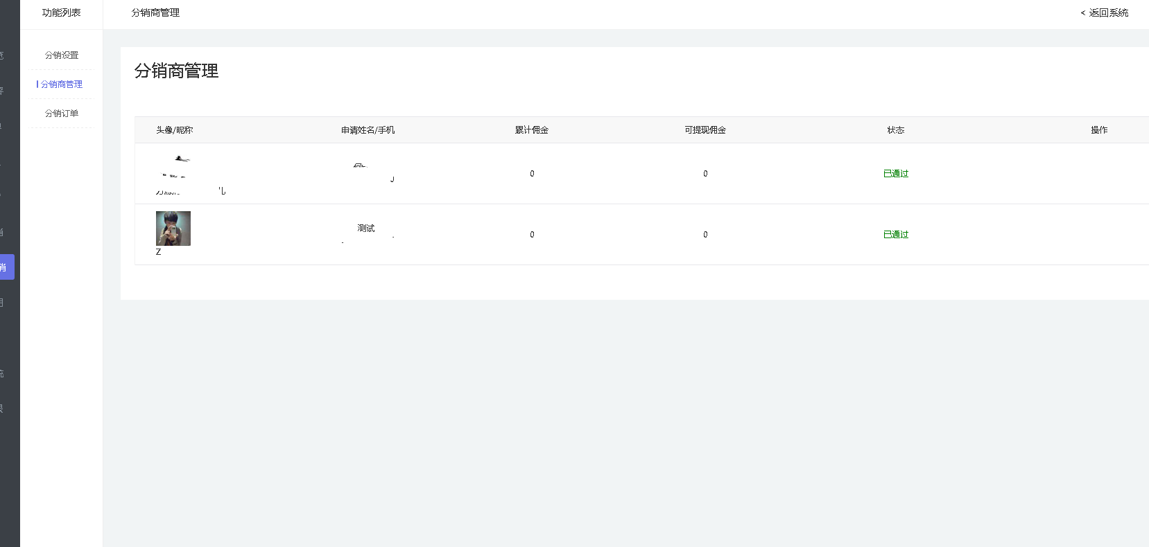 击左边的分销菜单进入后再点击分销商管理如图所示,在这里可以查看已有的分销商,若开启了审核模式,这里可以通过审核 、拒绝等
