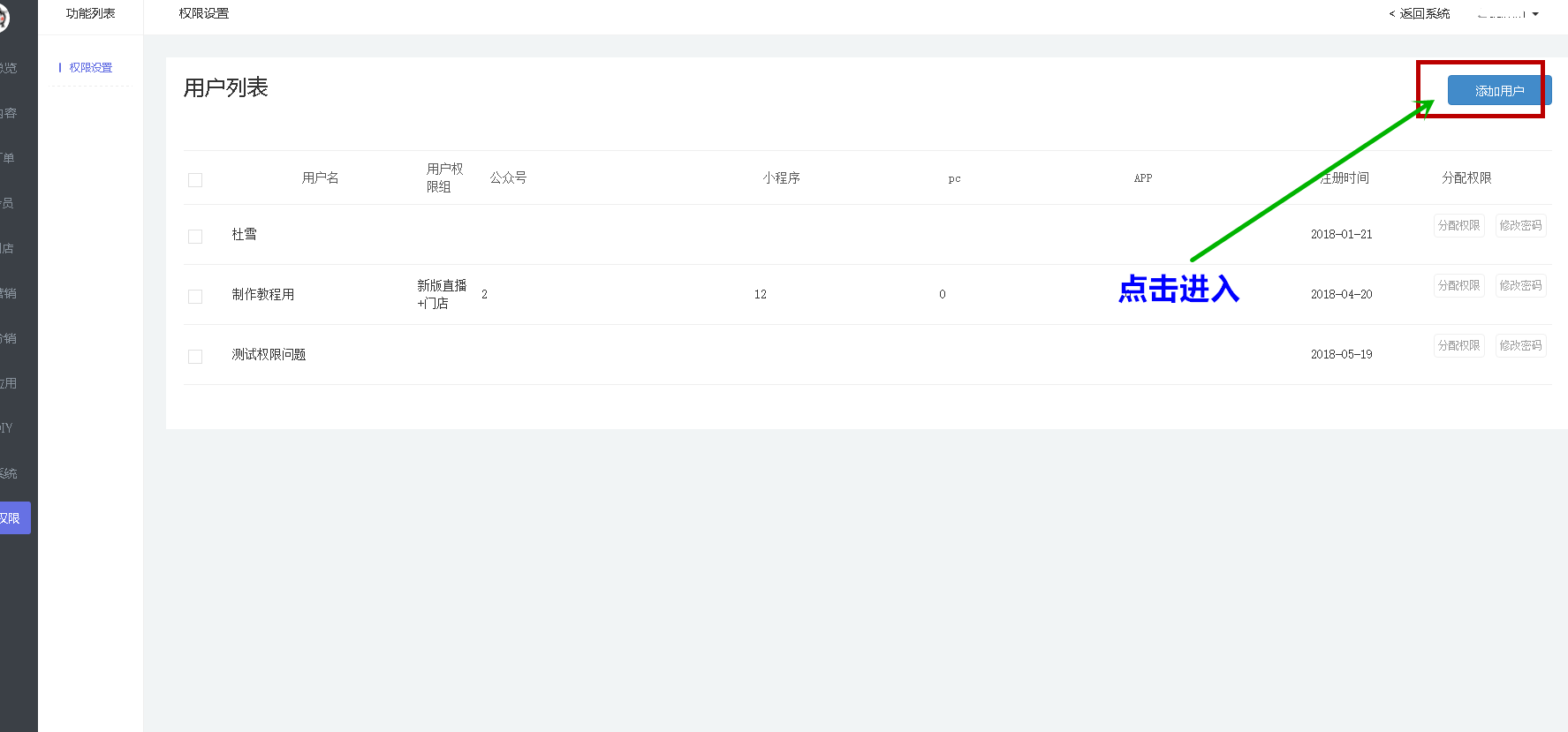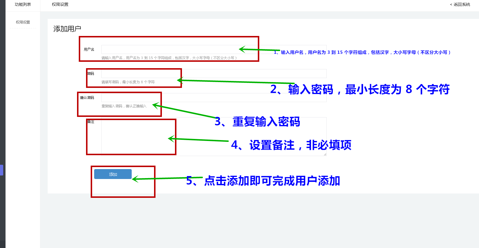 点击左侧权限菜单进入如下图一所示的界面后点击添加新用户进入用户添加界面,如下图二所示,并且根据图示填写完相信即可添加用户  图一  图二