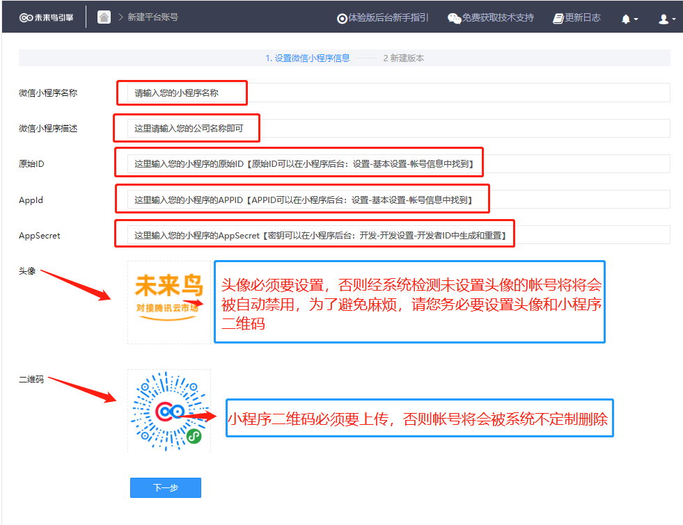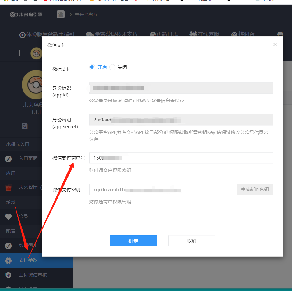 为了方便体验版未来餐厅以及SAAS对接版以及自助服务版用户在试用阶段仅为方便客户体验后台,如需对接体验前台可联系客服帮忙安排指导! 首席服务官微信账号为:`CQWLN2016`  ------------ - 添加应用之前的准备: - `小程序的对接需要您要有一个已认证过的小程序帐号和微信支付帐号` - 如果没有,请按照以下教程来进行申请和认证以及对接! - 服务号小程序以及微信支付的申请认证和对接教程 - 已经有了认证过的小程序帐号和可以按照以下教程进行对接即可! ###### 1.进入平台后,点击添加平台  ###### 2.新建微信小程序  ###### 3.选择手动添加微信小程序 并到微信公众平台后台获取原始 ID,APPID,密钥并把 WLN.26A.TOP 添加到公众平台合法域名中  微信公众平台官网:https://mp.weixin.qq.com/ 原始 ID 和 APPID 获取步骤:【APPID 和原始 ID 可以在小程序后台:设置-基本设置-帐号信息中找到】 小程序的 AppSecret 密钥:【密钥可以在小程序后台:开发-开发设置-开发者 ID 中生成和重置】 服务器域名填写的步骤为:【开发-开发设置-服务器域名-添加或修改】 请务必添加域名 wln.26a.top 五个域名配置都需要添加!完成后的案例如下:  ##### 4.新建单个小程序  ##### 5.输入您获取到原始 ID,APPID,秘钥即可!  ###### 6.选择小程序应用,并生成版本  ###### 7.进入应用的管理 点击左上角未来鸟引擎 LOGO 进入首页,然后进入应用后,填充和管理您新建的小程序应用  ###### 8.应用的设置和内容的填充 当您填充完毕以后,如果您的小程序需要支付和退款功能,请点击支付参数,添加在微信支付后台获取到支付信息,如果不需要支付,请忽略本步骤  ###### 9.上传微信审核  如果有需要跳转的小程序,请填写要跳转的小程序数量和 APPID 等信息,如果没有,请点击确认即可扫码上传,上传成功以后,到微信后台提交审核,审核通过以后,全量发布即可! `【注意,如果您的小程序没有申请开通直播功能,请不要选择直播组件】`