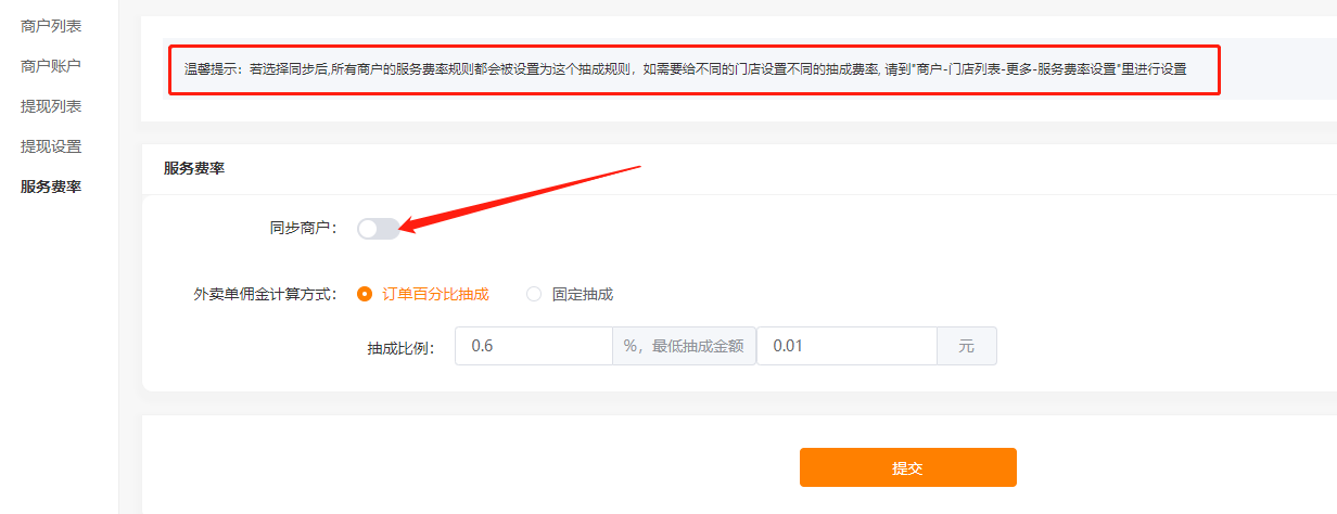 商户如何设置单独的服务费率? 必须要在关闭同步平台服务费率的情况下才能单独设置商户服务费率 路径:商户列表->更多->服务费率
