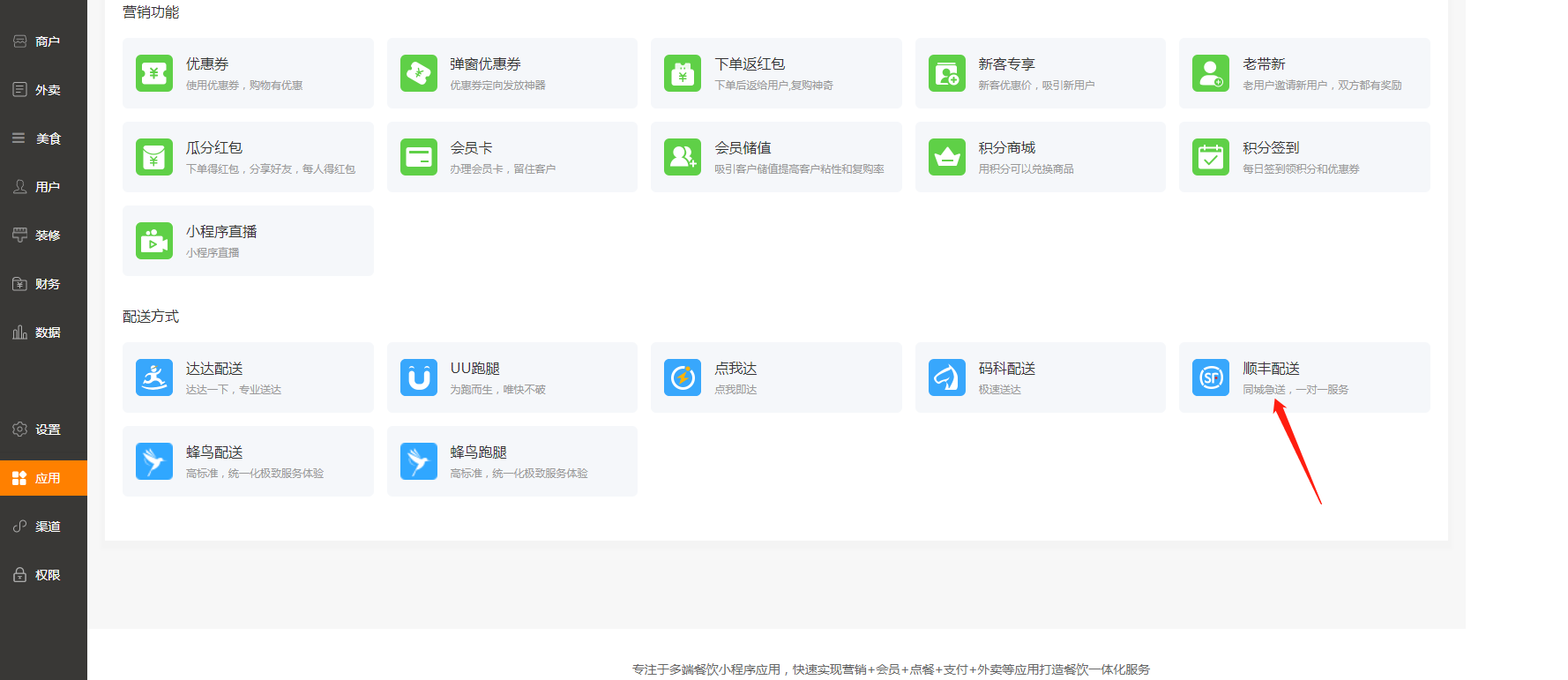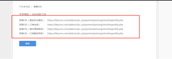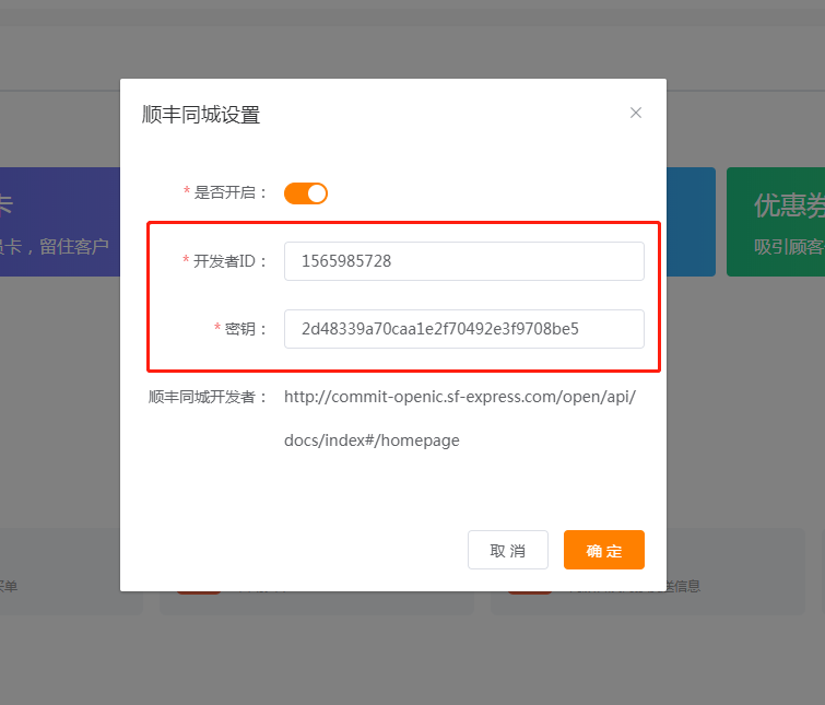 第一步:登录顺丰开发平台 首先登陆 http://commit-openic.sf-express.com/open/api/docs/index#/homepage 或者点击入未来餐厅后台->应用->配送方式->顺丰配送,也可以显示登录地址  然后注册登录顺封同城开发平台 登录后点击开发者中心  第二步:申请开发者 然后复制开发者ID和密钥  填写到未来餐厅顺丰后台  第三步:点击URL 填写https://wln.26a.top/addons/yb_cy/payment/peisong/shunfengnotify.php   第四步:创建店铺 输入跟当地顺风对接的店铺ID   然后在餐饮后台商户-配送设置这里启用顺丰,并输入商户ID保存即可  这样就对接完成啦!