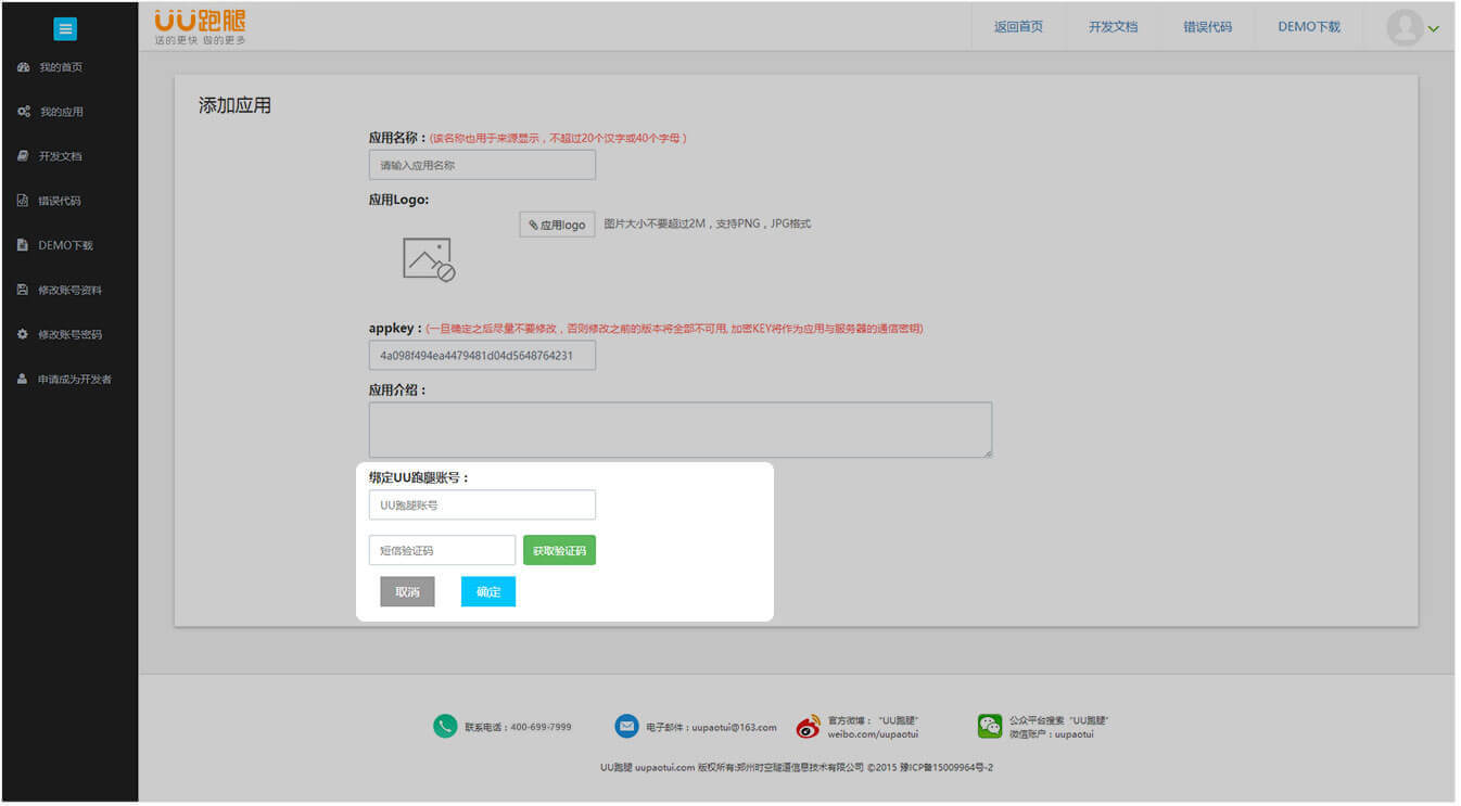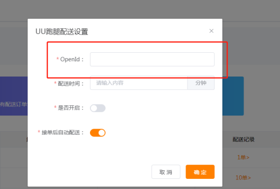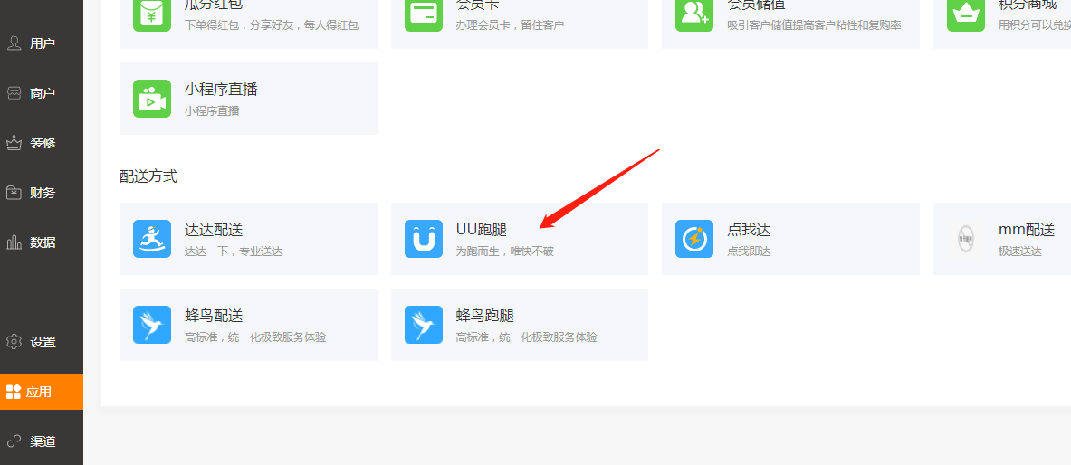 首先注册UU商家账号和UU开放平台账号 注册商家平台 1.注册UU跑腿商家平台账号(shangjia.uupt.com) 注册开放平台 2.注册UU跑腿开放平台账号(open.uupt.com)  2.注册成功后登录,进入“我的首页”  添加应用 1.点击右边菜单栏“我的应用” 2.添加需要对接的网站、APP、WINDOWS、获取Appkey  然后打开未来餐厅后台      复制appid key openid填到对应的地方即可,要保证商户后台有钱才会正常发单