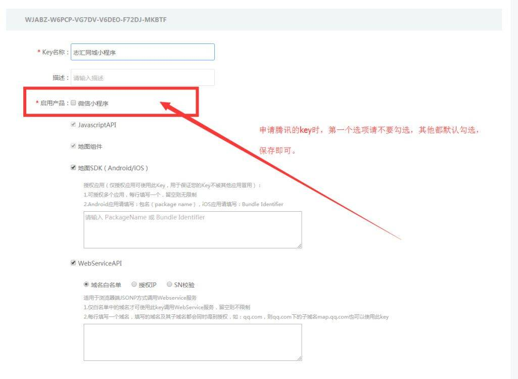 ### 小程序页面一直在加载 #### 出现这样的情况一般是腾讯key的问题 1. 没有将apis.map.qq.com和restapi.amap.com两个网址添加到服务器域名当中  #### 2. 腾讯key申请的有问题,申请地址http://lbs.qq.com/qqmap_wx_jssdk/index.html;请严格的按照下方配置。