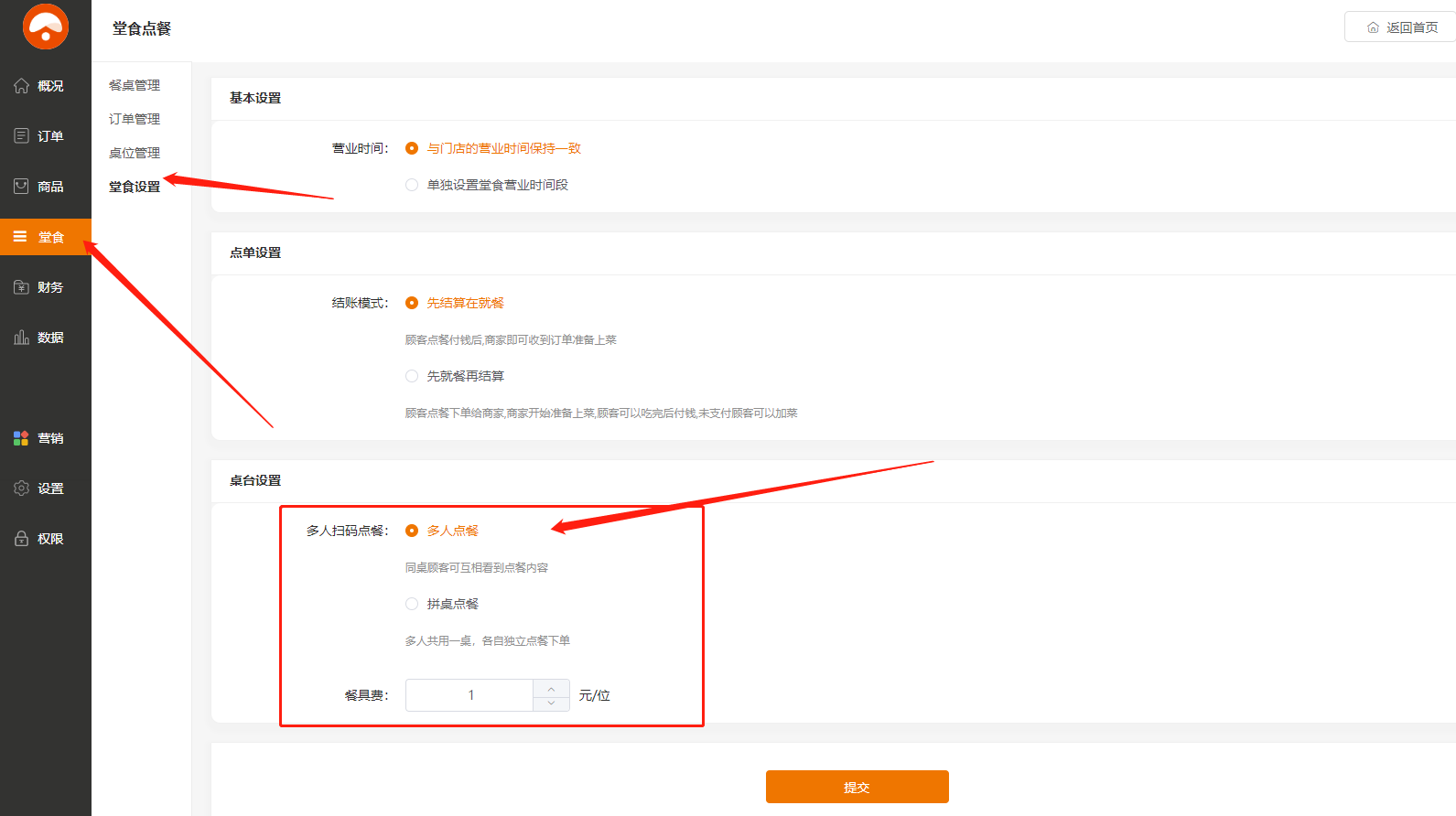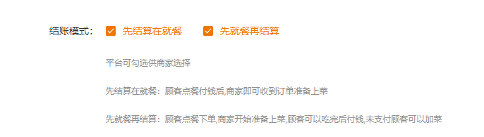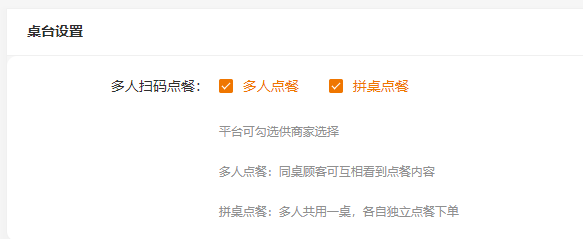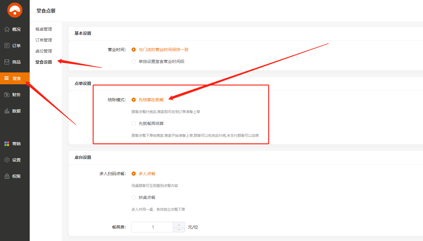 路径:后台->堂食->堂食设置  ### 1.点单设置 顾客下单时判断地理位置 此功能开启后系统会根据顾客位置信息判断顾客能否正常下单  ### 2.结账模式 分为先结算再就餐和先就餐再结算,管理员可自行勾选(平台勾选的结算方式用来供商家在商户后台选择要用的结算方式)  先结算在就餐:顾客点餐付钱后,商家即可收到订单准备上菜 先就餐再结算:顾客点餐下单,商家开始准备上菜,顾客可以吃完后付钱,未支付顾客可以加菜  餐前支付订单关闭时间 用户选择餐前支付,未支付时多少分钟后自动关闭订单  ### 桌台设置 多人扫码点餐 分为多人点餐和拼桌点餐两种模式(平台勾选的点餐方式用来供商家在商户后台选择要用的多人点餐方式)  #### 多人点餐: 同桌顾客可互相看到点餐内容 #### 拼桌点餐: 多人共用一桌,各自独立点餐下单  ### 商家后台设置 路径:商家后台->堂食->堂食设置 商家可在后台单独设置堂食的营业时间 可自主勾选平台提供的结账模式和多人点餐模式 可自定义桌位费