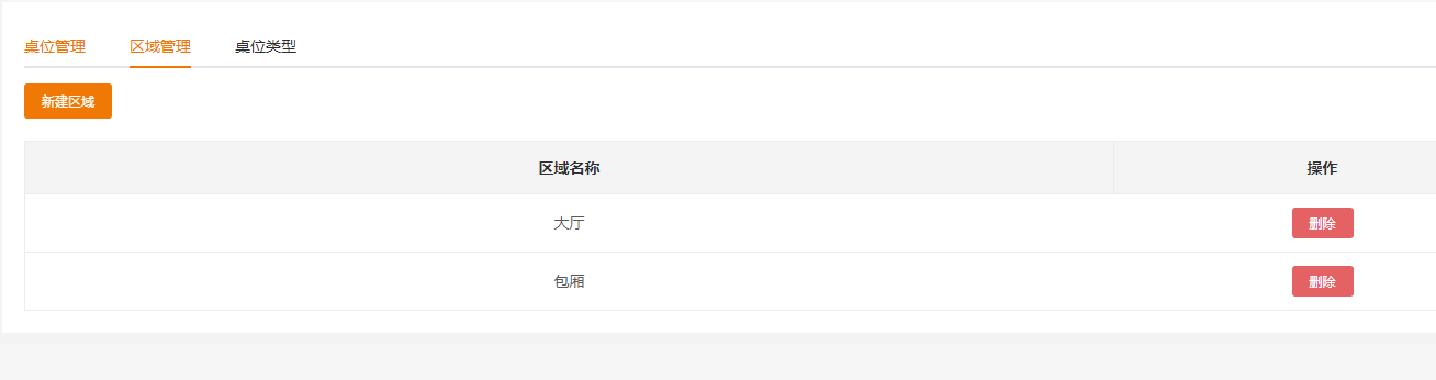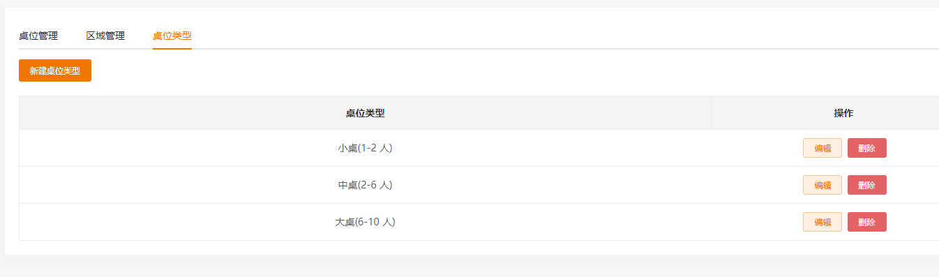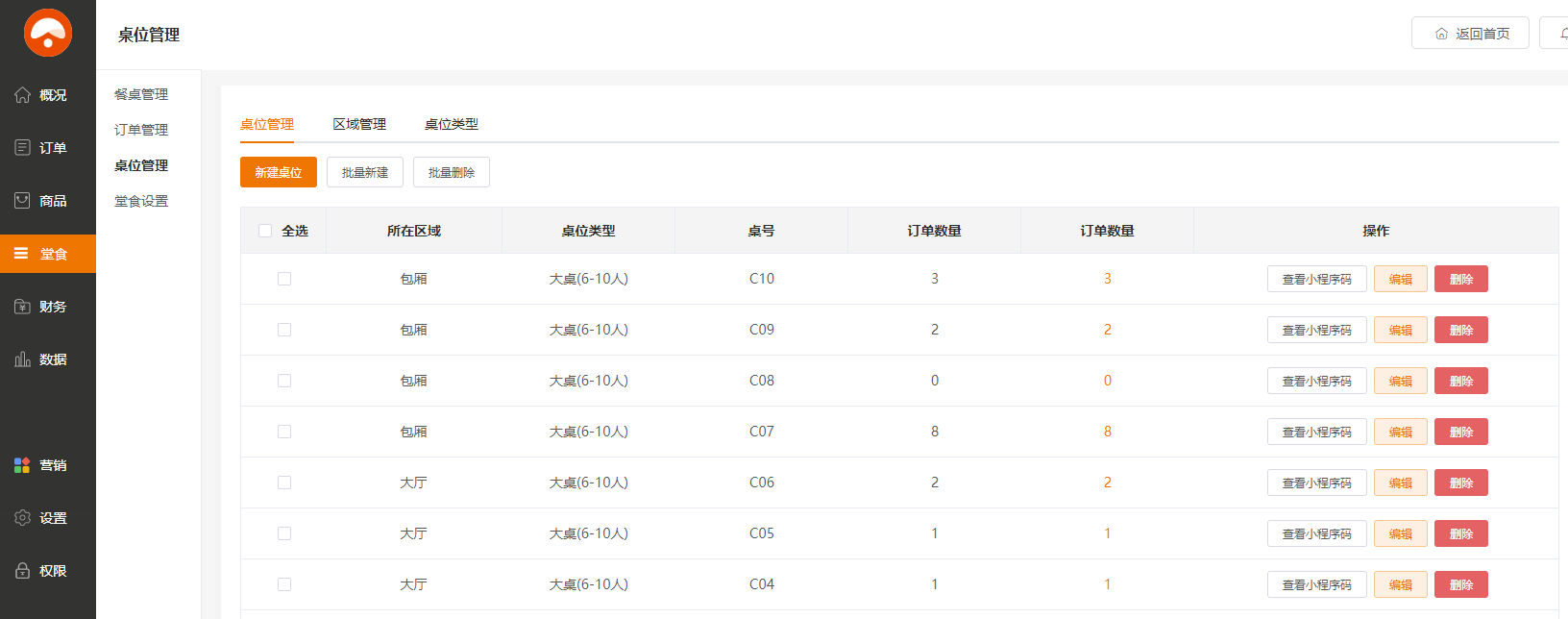 路径:商户后台->堂食->桌位设置 商户可在后台管理桌位,包括新增就餐区域、桌位;管理桌位状态,进行开台、清台等操作,实时查看桌位情况 # 桌位管理 新建桌位需要先创建就餐区域和桌位类型    # 餐桌管理 已添加的桌位可在商户后台查看和修改状态