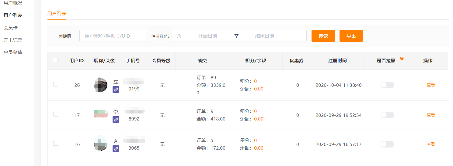 # 用户概况 小程序规则:只要一个用户点击了您的小程序,那么它就是您的会员了。 “会员概况”里包括:不同时间内新增会员数量、消费会员占比以及会员活跃度分布示意图。 您可以根据这些数据,来调整小程序及商品的推广营销策略。  ------------ # 用户管理 功能路径:后台>>用户>>用户管理 介绍:这里的会员信息是指进入到小程序中的用户,用户确认授权后,可以获取到昵称、性别等信息,包括领取了会员卡的用户(但不仅限于领了会员卡的用户) 填写了手机号码的用户。商家可以给此类用户充值余额。  点击“查看”,可以见到单个用户信息和购买记录、统计信息。