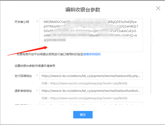 进入百度小程序后台 点击开发管理->设置->开发设置  复制后分别填写到餐饮端后台  点击运营中心->支付管理->支付设置  复制后分别填写到餐饮端后台  下载openssl https://www.openssl.org/source/ 安装后打开  输入genrsa -out rsa_private_key.pem 1024 回车 再输入 rsa -in rsa_private_key.pem -pubout -out rsa_public_key.pem 回车 Openssl运行目录下会生成两个文件  打开rsa_pubilc_key.pem文件 复制中间内容 头尾不要   复制到开发者公钥提交保存  支付回调地址: https://www.b-ke.cn/addons/bk_cy/payment/wechat/baidunotify.php?uniacid=3 退款回调地址: https://www.b-ke.cn/addons/bk_cy/payment/wechat/baidurefundnotify.php?uniacid=3 退款审核地址 https://www.b-ke.cn/addons/bk_cy/payment/wechat/baidurefundnotify.php?uniacid=3 打开刚刚生成的两个文件 复制rsa_pubilc_key.pem 全部内容到百度支付公钥 复制rsa_private_key.pem 全部内容到百度支付私钥  然后添加后台域名和定位域名apis.map.qq.com   下载百度开发者工具安装 再下载百度安装包,然后解压  打开开发者工具,点击导入项目 项目名称填下,项目目录选择yb_yc目录即可  Appid复制百度小程序的appid  打开之后,点击  搜索Siteroot 更换域名和uniacid  网址替换成自己的网址 uniacid填写未来鸟引擎后台的uniacid 鼠标放在管理设置会显示   提交审核即可
