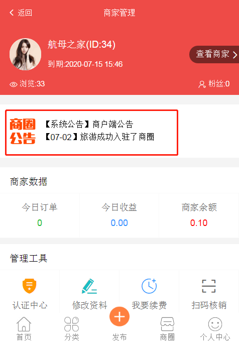 ### 公告管理 这里的公告分为两个类型,商家端和用户端 商家端的公告在商家中心显示,用户端的公告在用户端显示 公告也可以设置显示区域,可以对不同的地区发布不同的公告 _1610588008.jpg)