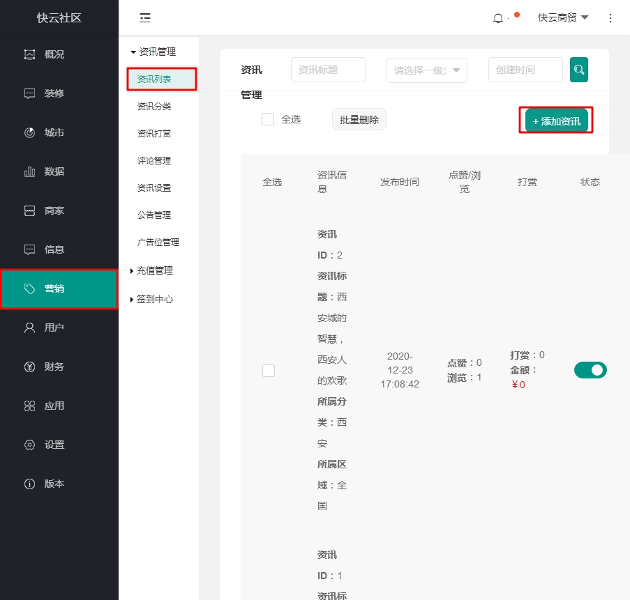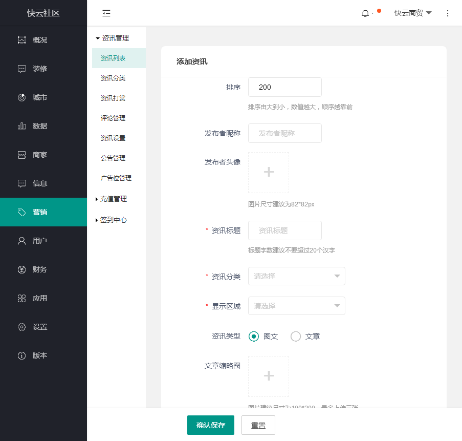 ### 资讯列表 #### 资讯主要功能就是短新闻,可以进行打赏、评论、点赞、分享  进入资讯页面只有批量删除功能,资讯只能后台发布 可以进行编辑,查看打赏记录 点击添加资讯  填写基本信息 资讯有图文和文章两种形式,文章是可以填写腾讯新闻的链接的 同样要先设置分类、置顶和精华帖会带有特殊标签
