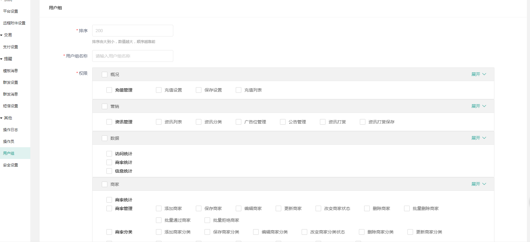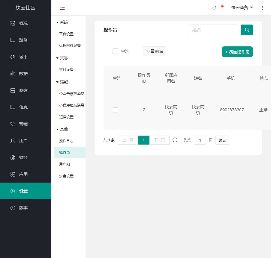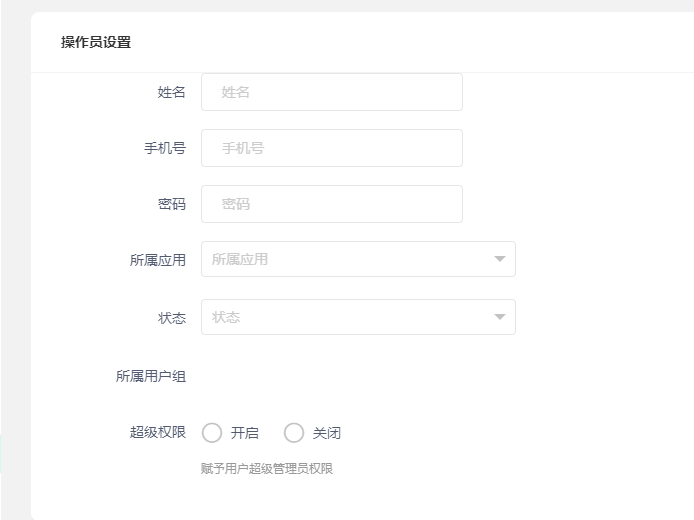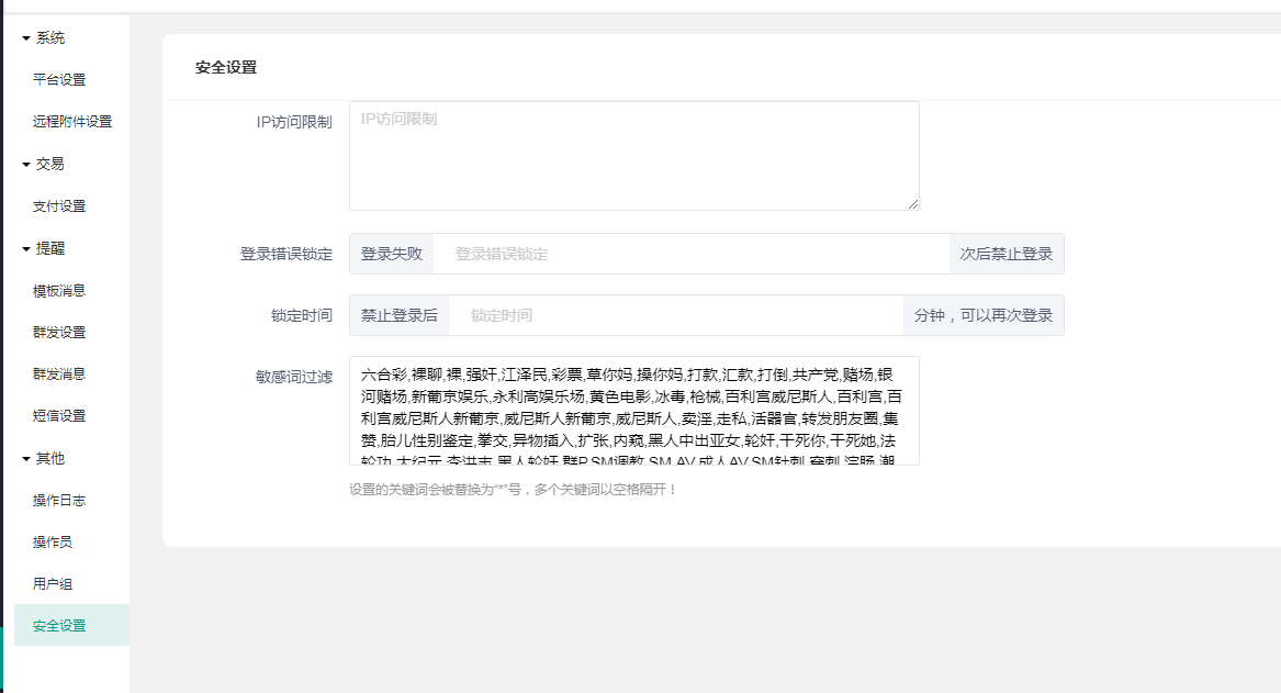 ### 其他 操作日志,可查看所有操作信息 _1610595146.jpg) 操作员,可设置后管理系统  点击添加操作员  选择应用,选择用户组,用户组是来分配权限的  可限制IP访问、登录错误锁定、锁定时间、敏感词过滤