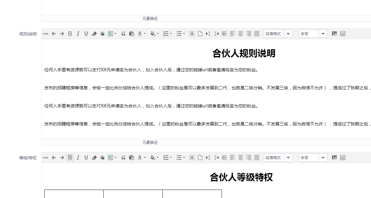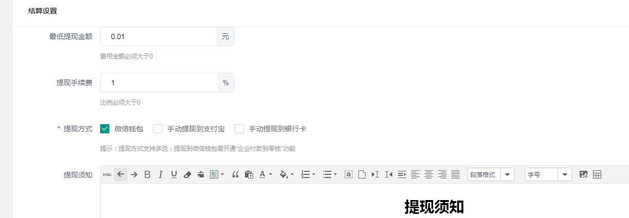 ### 合伙人设置 _1610602452.jpg) 合伙人名称可以自定义 也可以选择分销层级,最多二级 下面协议可在网上参考   结算设置,提现最低金额,低于这个金额则不能提现 提现手续费,设置0则没有手续费,提现方式有微信钱包、支付宝、银行卡 支付宝和银行卡都是手动提现 _1610602760.jpg) 合伙人分享,小程序不适用