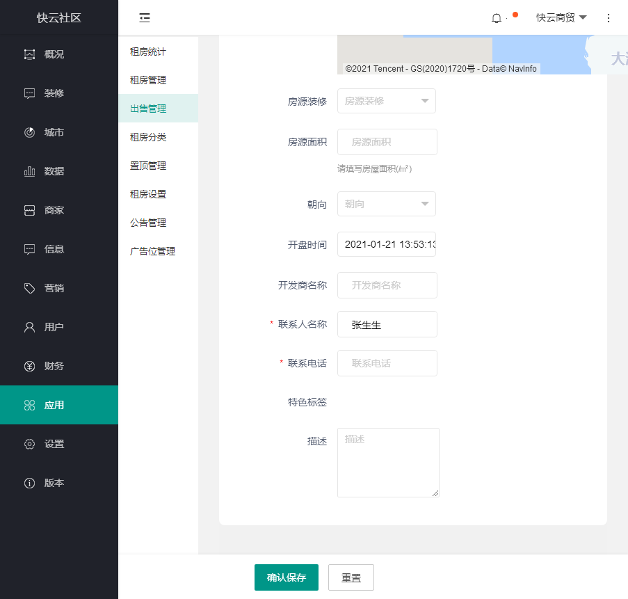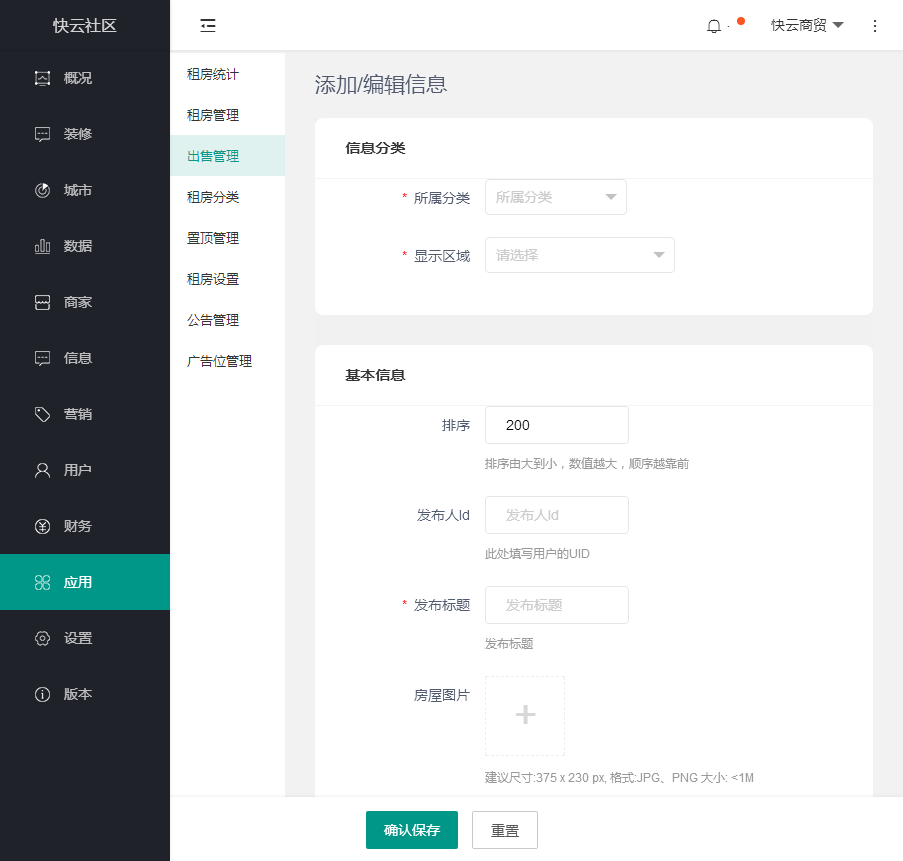 ### 出售管理 _1610603559.jpg) 出售管理,本页面可批量操作,主要管理房屋出售类的信息 点击发布   信息填写完整后,点击保存即可