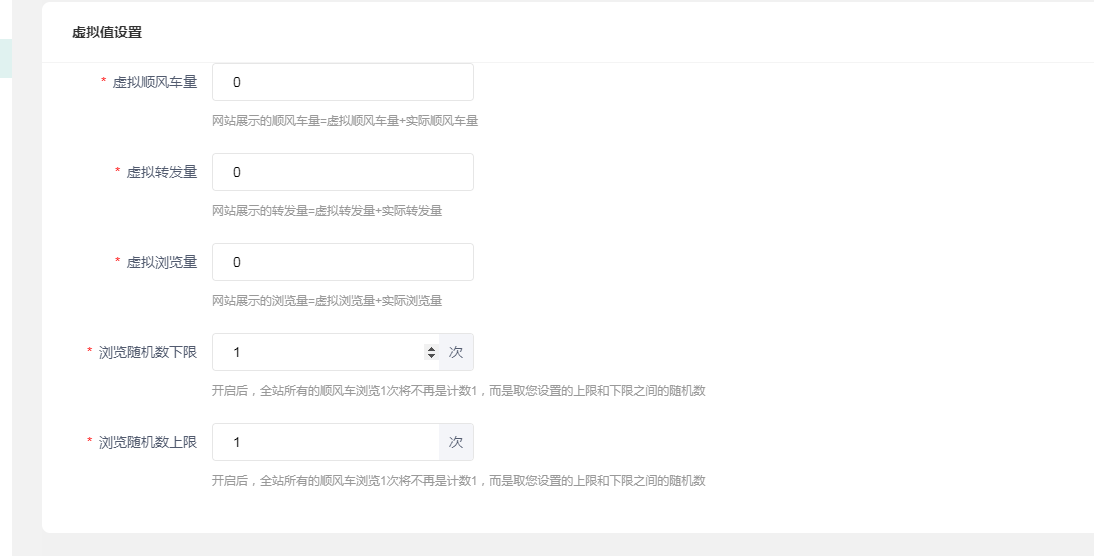 ### 顺风车基本设置  设置和其他设置方法和原理一样  网站展示的顺风车量=虚拟顺风车量+实际顺风车量 全部设置好点击保存即可