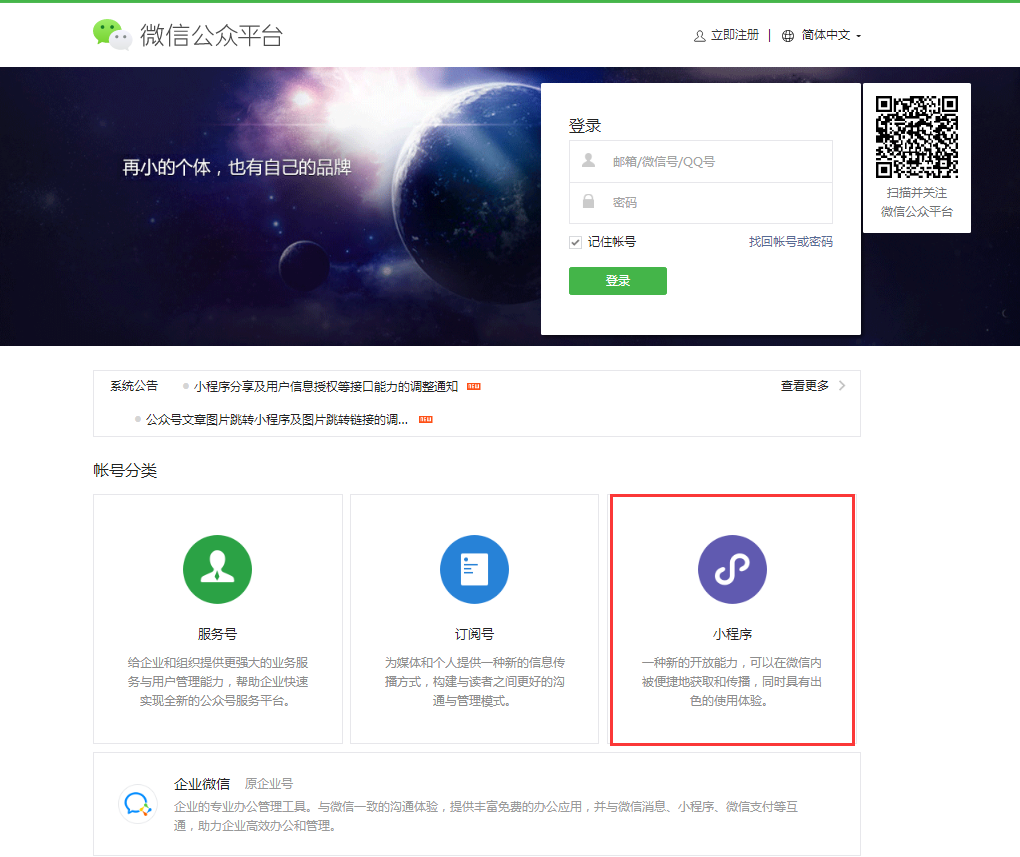 2、微信公众平台创建小程序