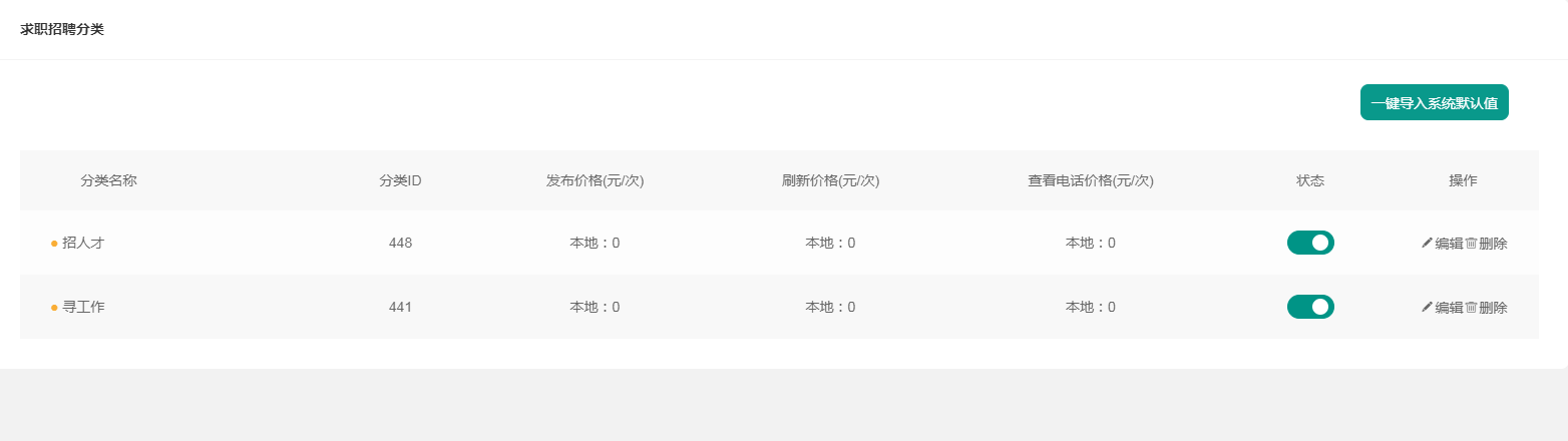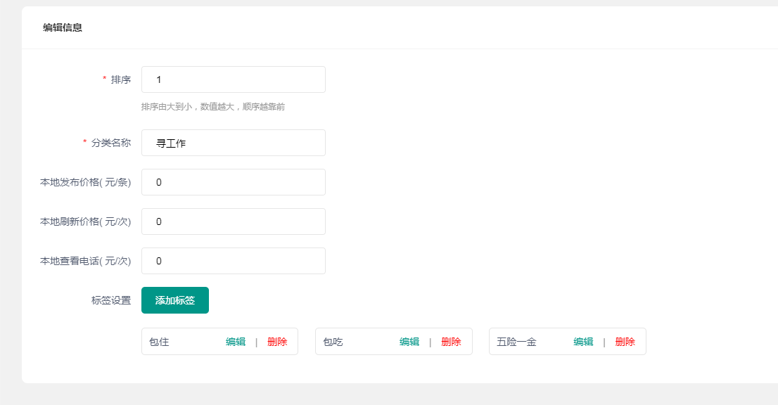 ### 分类管理  导入默认值后修改内容  价格和标签在这里设置 找工作多了查看电话一项,有人需要查看人才电话此功能生效