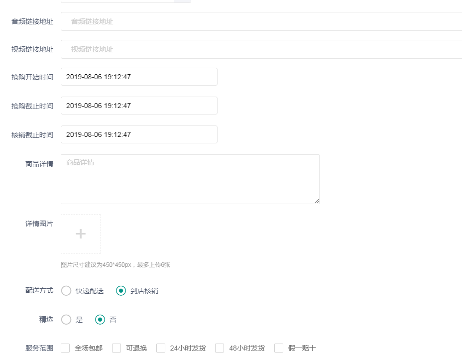 ### 抢购商品管理  可进行批量操作,主要功能用来审核商家发布的抢购商品,我们也可以自己在后台添加抢购商品 点击添加商品  绑定商户,该商户必须已注册当前平台,数据真实有效,填写商户的ID即可,商户ID在商家管理页面查看 所属分类必填,注意填写每人限购数量,和库存数量  音频连接地址支持.mp3结尾的,视频连接支持.mp4结尾的 设置好开始和结束时间,核销截止时间意思是,在这个时间段内可以核销,过了这个时间段后订单作废,核销截止时间必须晚于抢购截止时间 如果选择快递发货,则不需要 精选的意思跟推荐差不多,会出现在单独的类别里