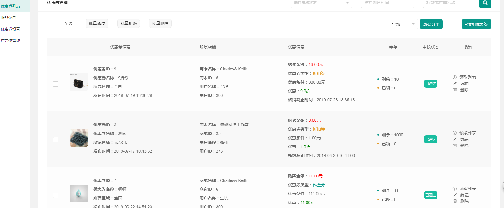 ### 优惠卷列表  可进行批量操作管理优惠卷,点击领取列表可查看该卷的领取情况  点击添加优惠卷  到期时间,意思是优惠卷的时效,过期作废 代金券,可设置条件,满多少减多少 折扣卷,设置折扣 优惠卷,跟代金券功能一样 可限制没人领取数量