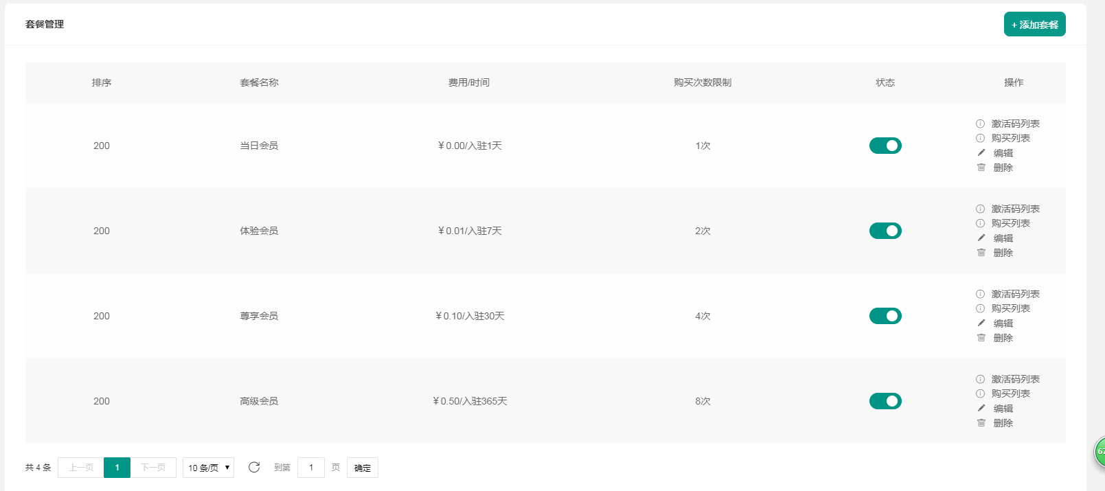 ### 会员卡套餐  会员卡套餐和商家套餐类似,可设置多个,多少天多少钱 点击添加套餐  填写完保存即可