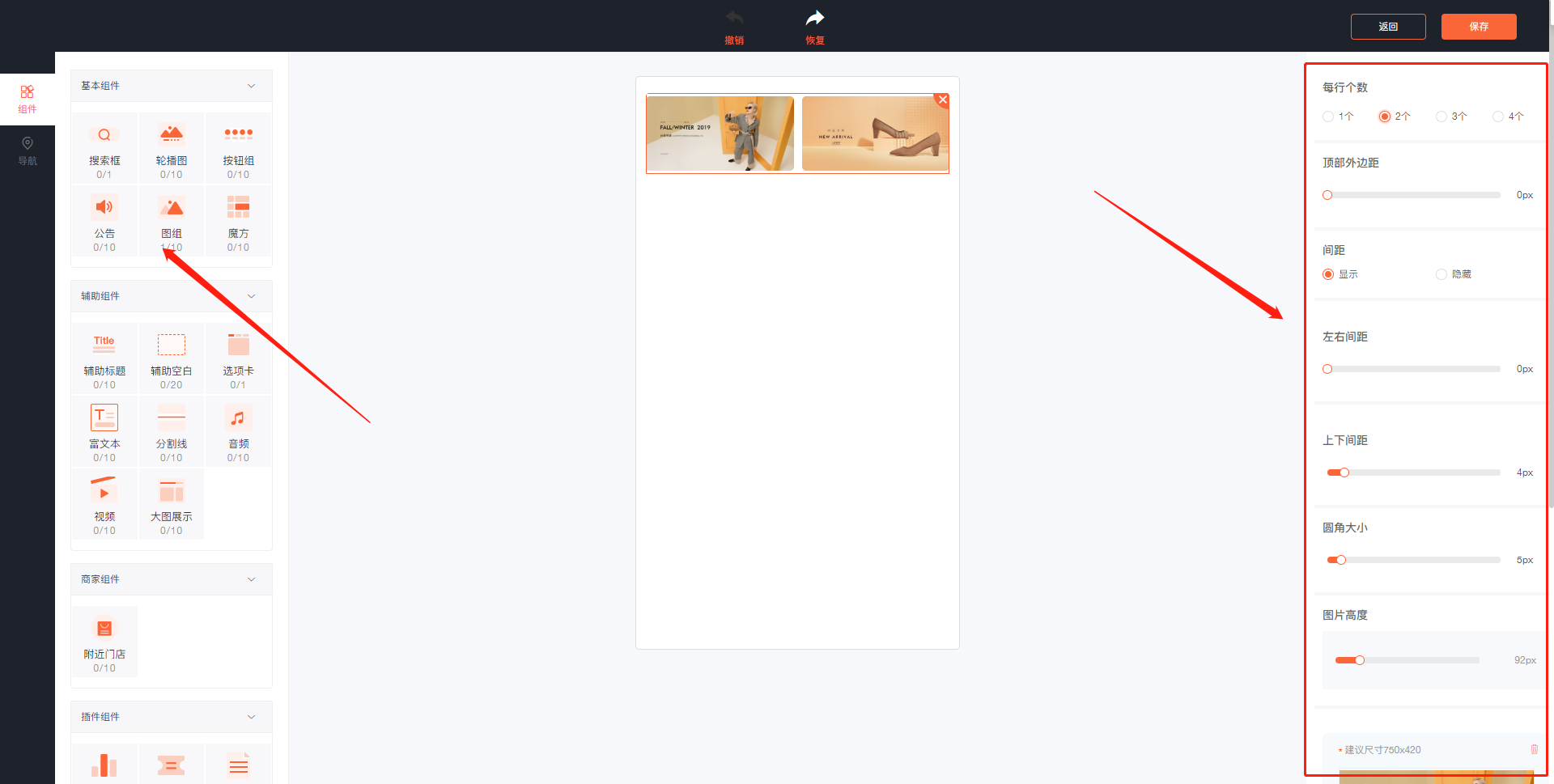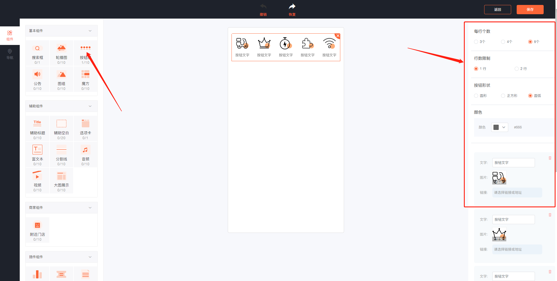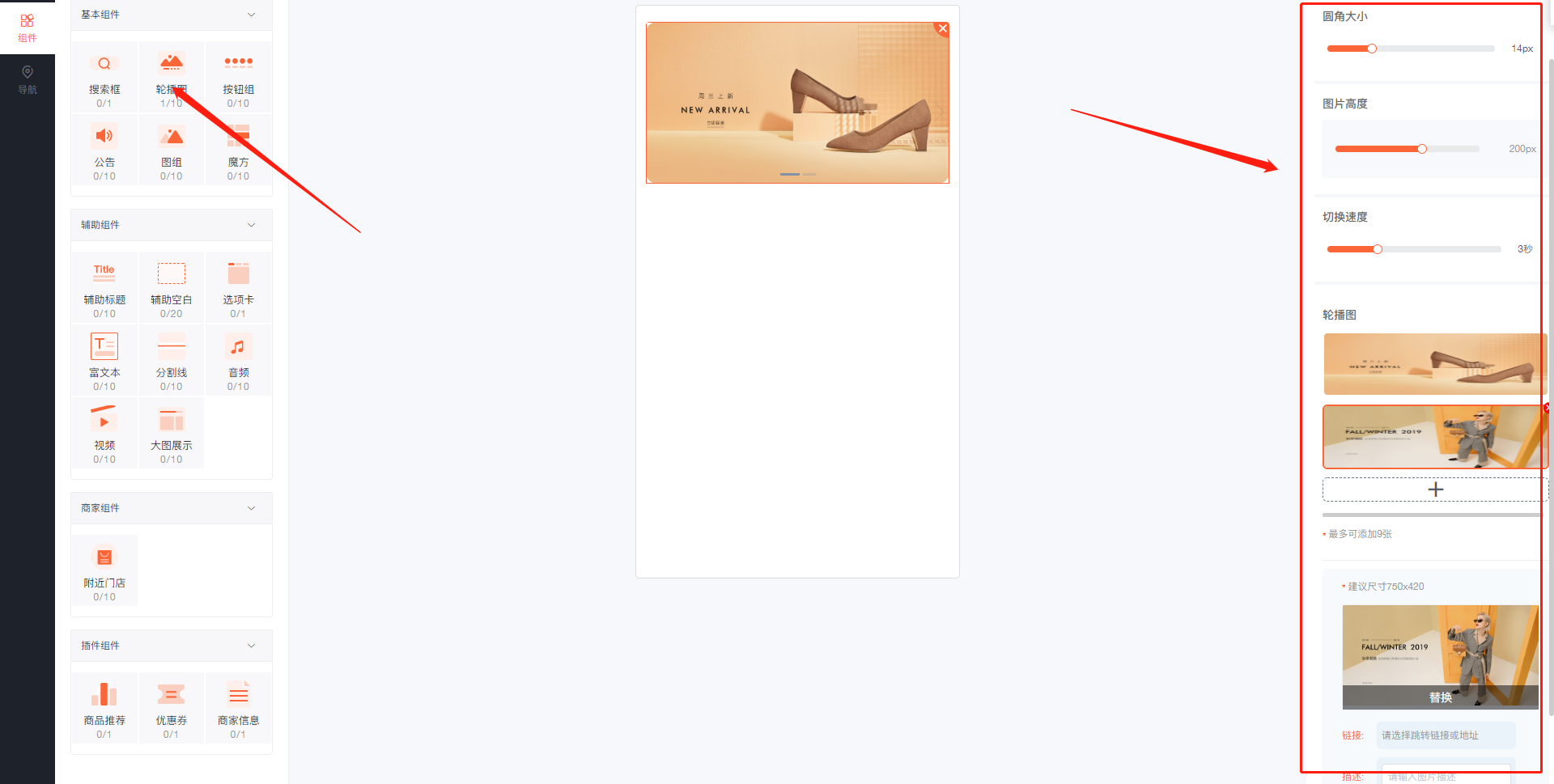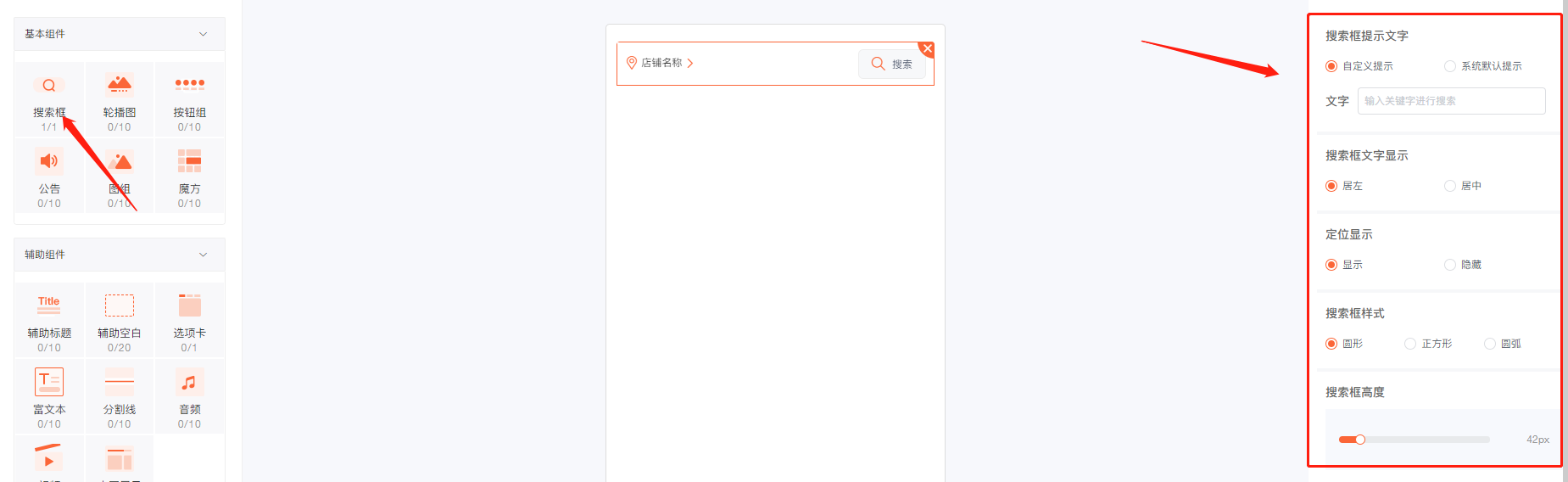 # 装修页-基础组件介绍装修页-基础组件介绍  # 搜索框: 1、左侧可显示店铺名称,方便切换店铺; 2、自定义搜索提示文字; 3、自定义搜索框边角样式; 4、自定义搜索框高度;  # 轮播图: 1、自定义轮播图圆角大小; 2、自定义图片高度; 3、自定义轮播图切换速度; 4、可上传外部图片,图片可添加链接,链接包括入口页面链接、小程序跳转链接、拨打电话和外部网页链接。     # 按钮组: 1、自定义每行按钮数; 2、自定义按钮行数,如:设置1行按钮,每行5个,按钮数超出5个的话,按钮组可左右滑动切换; 3、自定义按钮形状; 4、自定义按钮组文字颜色和文字; 5、按钮组可上传外部图片,图片可添加链接,链接内容同上。  # 公告: 1、公告可跳转链接,链接内容同上; 2、公告标题可设置文字标题,也可上传图片标题; 3、公告内容单独添加  # 图组: 1、自定义一行显示个数; 2、自定义组件上下左右间距; 3、自定义图片圆角和图片高度; 4、可上传外部图片并给图片添加链接,链接内容同上  # 魔方: 1、布局可左右切换; 2、自定义组件上下间距; 3、自定义图片圆角; 4、可上传外部图片并给图片添加链接,链接内容同上