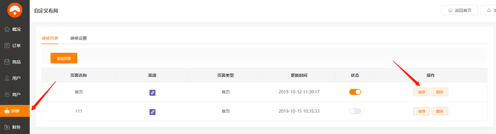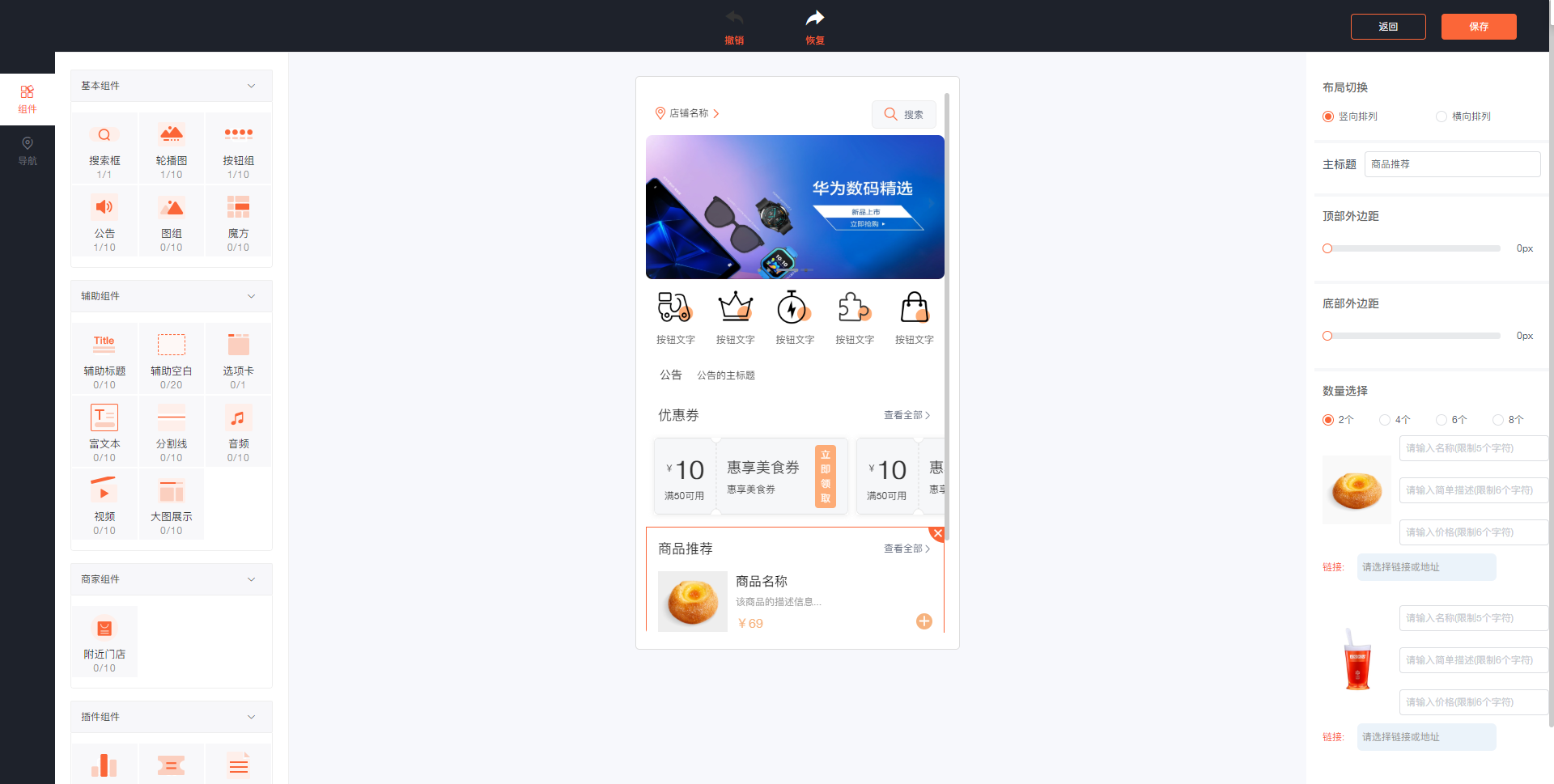 绑定小程序之后可进入到店铺装修页面。可以选择导入系统默认值装修,也可以自己创建页面自定义装修 **路径:后台>>装修**  **装修组件可以自由上下拖动位置**  自定义首页设置: 点单页、商家主页、商家列表页均可作为首页展示 自定义商家列表页跳转链接: 可跳转到商家点单页或者商家主页 自定义点单页左侧分类样式: 1、无图标; 2、图标文字上下排列; 3、图标文字左右排列  **手机端演示**