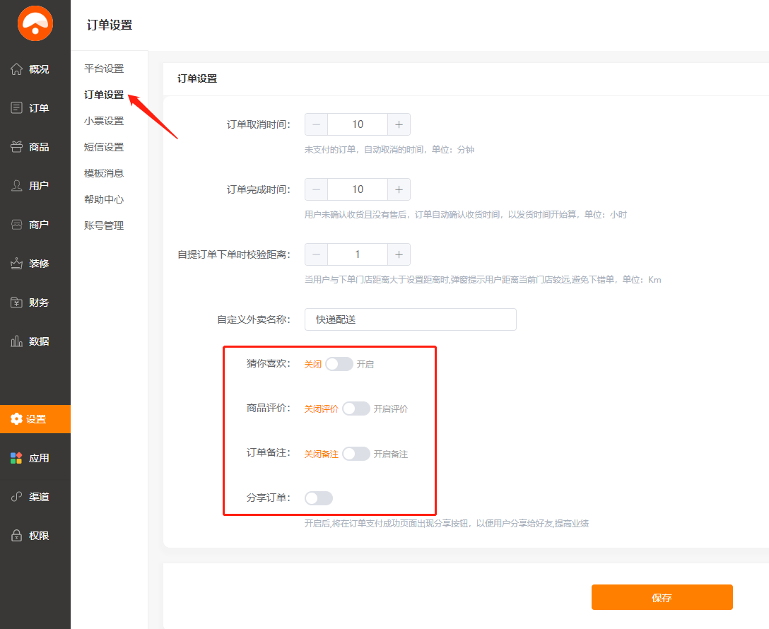 功能路径:后台--设置--订单设置 介绍:商家收入和支出的数据。可以按照不同门店、订单来源、订单号和下单时间筛选信息。 商家设置自动取消订单的时间,用户下单后迟迟不付款,到达设置的时间后,订单自动取消,订单完成的时间是指,用户下单发货后没有确定收货,到达商家设定的时间后自动完成订单。 外卖名称可自定义设置 店铺页面可以选择是否展示 1、猜你喜欢; 3、商品评价; 4、订单备注功能是否开启; 5、是否支持分享订单