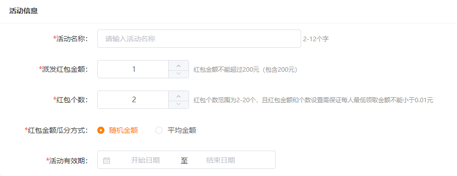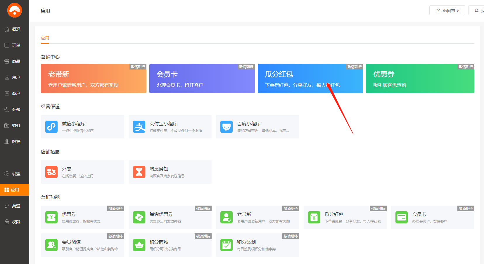 分红包是商家为了引流和吸引顾客的一种营销手段,可以借助好友关系,裂变式获取流量。 新建瓜分红包 操作路径:登录后台->【应用】->【瓜分红包】->【新增活动】   ** ①基本信息** 红包的玩法有两种:随机金额和平均金额,根据店铺需要选择使用; 活动有效期设置不能重复,即两个活动的时间不能重叠和交叉; 按照页面提示填写和完善好其他信息  **②使用条件** 设置触发红包的支付金额,即用户支付多少元自动领取红包  完善好以上信息确认保存或点击保存后发布即可。 活动的状态分为:未开始、已结束、进行中三种状态。
