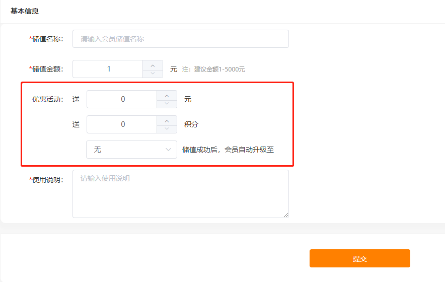 # ▌会员储值功能介绍 【会员储值】是一款可帮助商家提升客户忠诚度、增强会员粘性的营销活动。商家可根据需要创建储值规则,并配置不同的储值营销活动来招募更多的新会员和刺激会员消费。 # ▌功能路径 **操作路径:**打开后台->【应用】->【会员储值】->【储值规则】->【新建储值规则】   # ▌流程介绍 1、设置储值规则 - 储值规则名称:如充100送20 - 储值金额:即充值金额,可设置大于0的整数,建议金额1-5000元 - 优惠活动:充值一般配合营销活动使用,如充值送金额、送积分、送会员(具体到等级);条件可多选。 - 使用须知:一般填写一些储值卡的规则、使用限制等等….  设置好以上内容,保存即可。