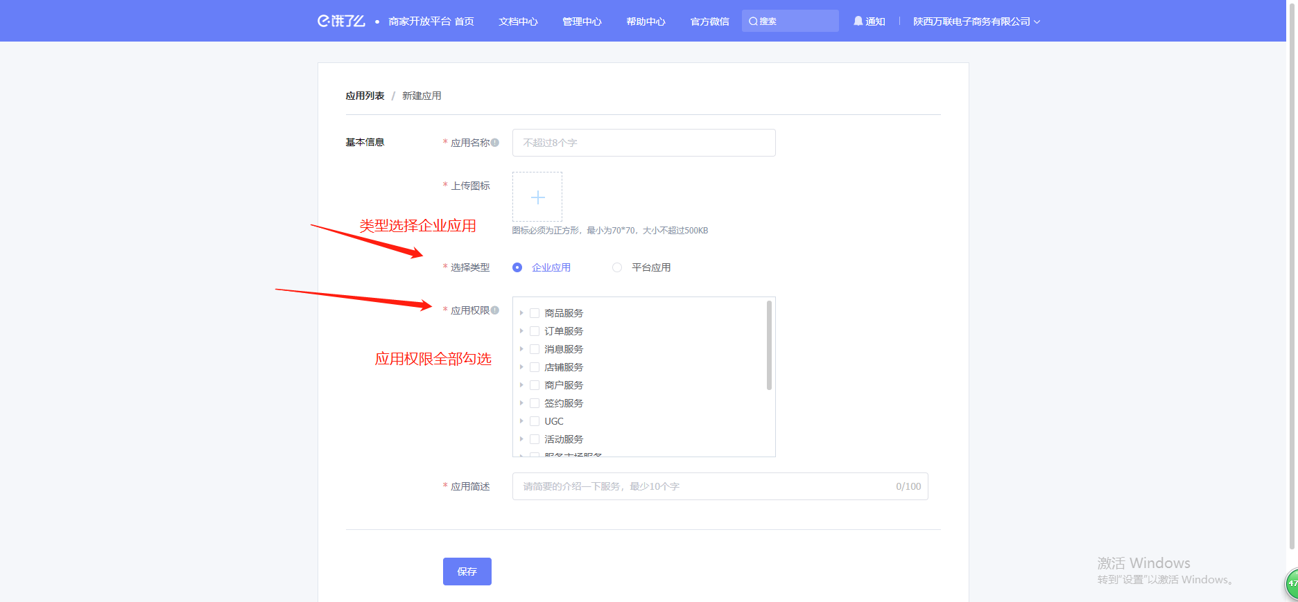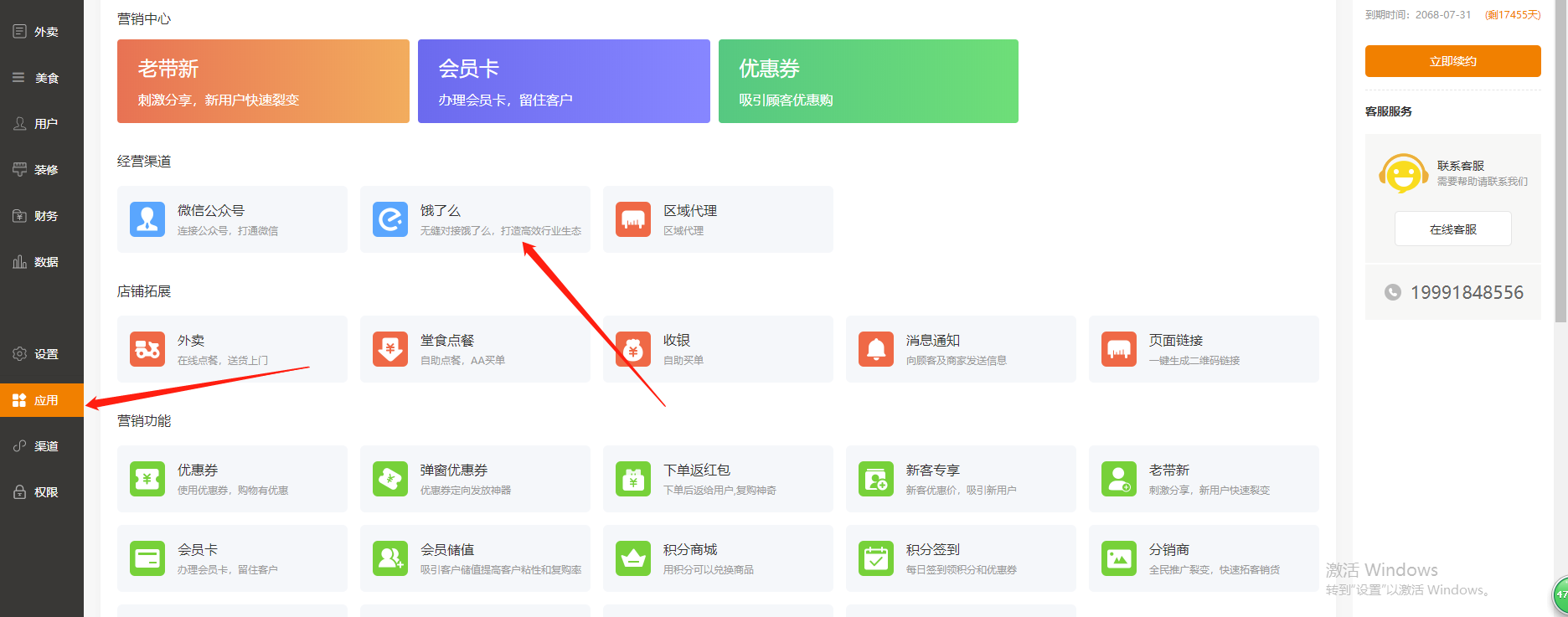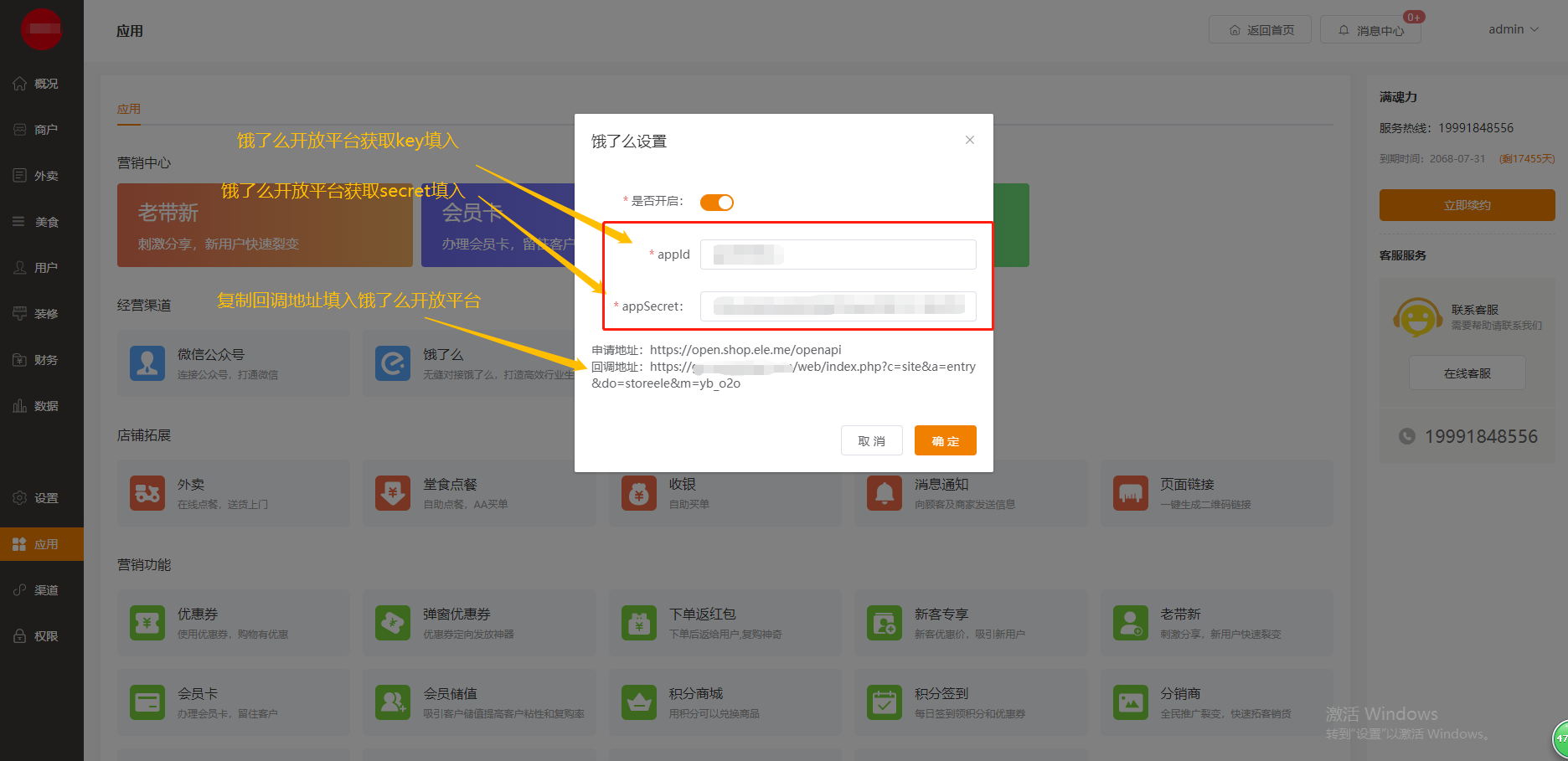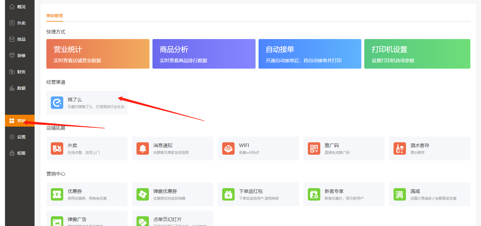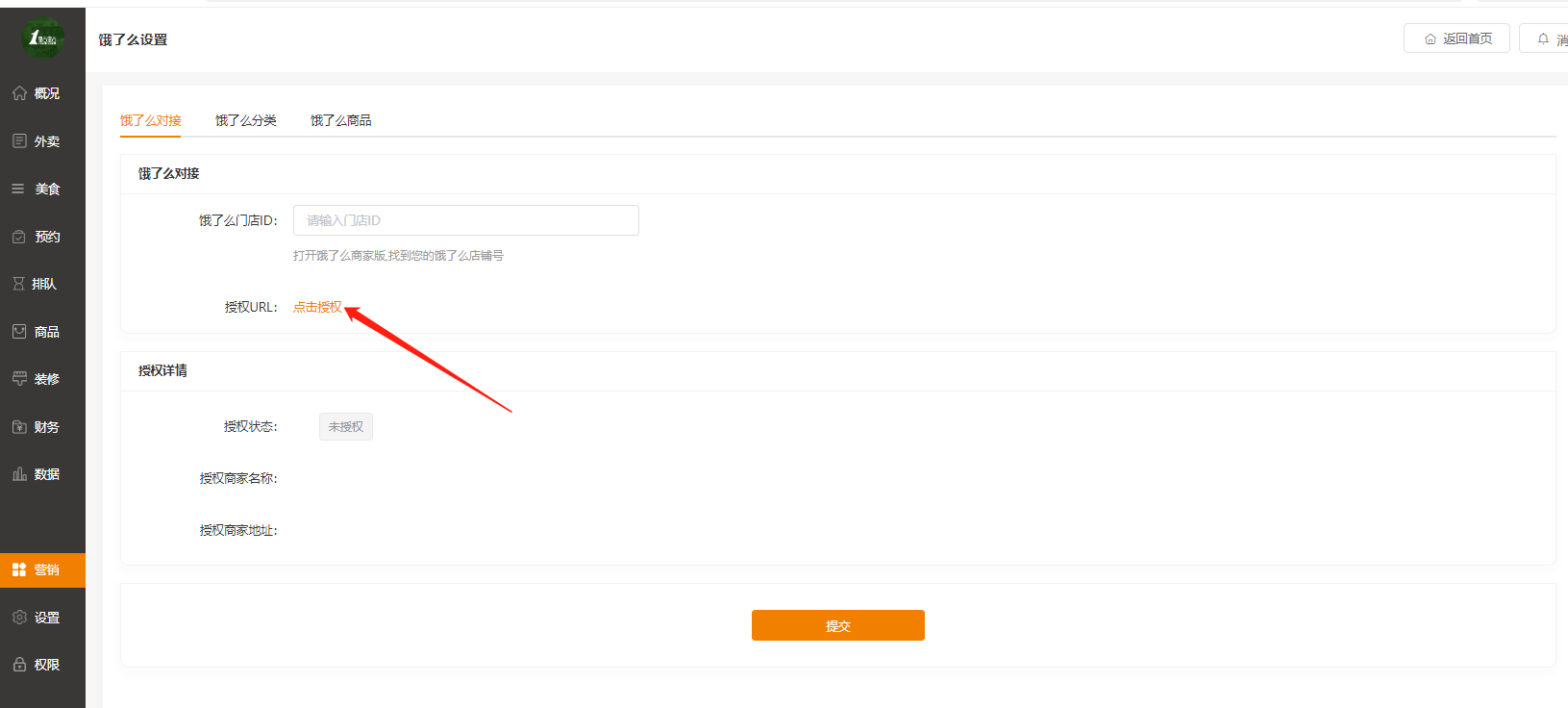 功能路径:进入后台>>应用>>饿了么 介绍:支持对接饿了么商品及商品分类  # 一、进入饿了么开放平台注册账号 :https://open.shop.ele.me/openapi;注册完以后登录饿了么开放平台  # 二、点击管理中心,新建应用, 填写相关信息后保存    类型选择企业应用,应用权限全选,设置完以后保存提交。  点击查看应用,在正式环境里,将key和sercet填写到未来鸟后台应用-饿了么里,然后将后台应用-饿了么里的回调地址URL复制粘贴过来,其他可为空选,具体如下图:  然后保存正式环境设置,重新提交应用审核,等待审核  至此饿了么开放平台的申请注册到此结束 # 三、登录未来餐饮平台-应用 -饿了么填写相关信息  # 四、进入商户管理后台-营销-饿了么 输入饿了么门店id点击授权即可