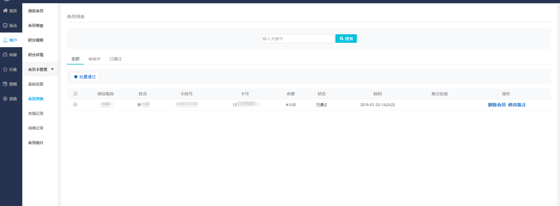 ### 会员列表 会员列表可以查看会员用户,可以批量审核通过会员,可以通过关键字搜索,也可以修改会员的备注信息。