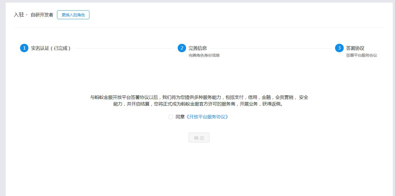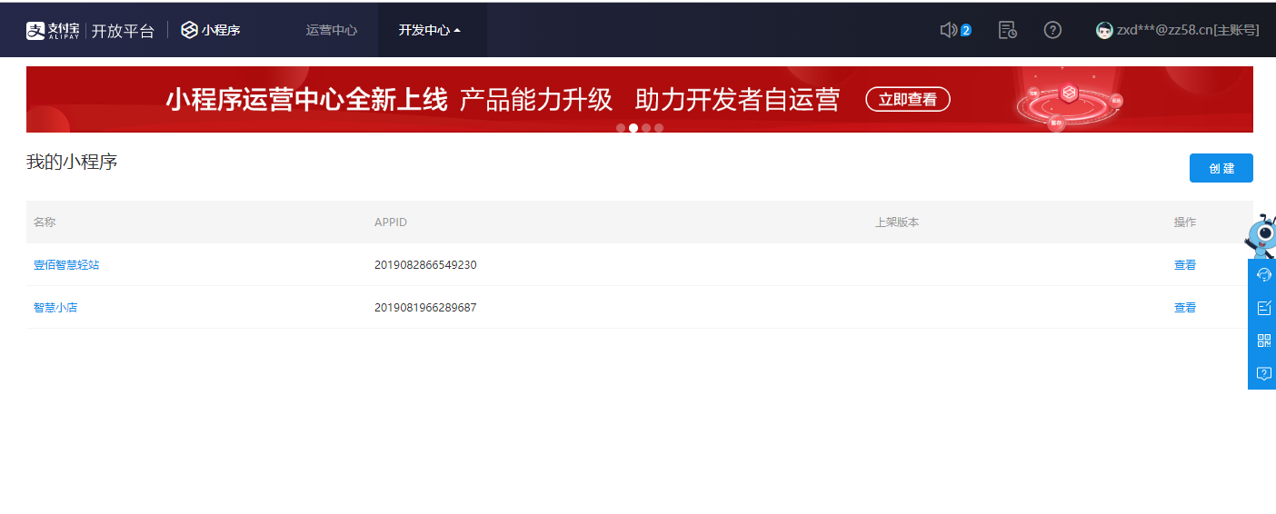 第一步、注册支付宝账号,注册入口https://memberprod.alipay.com/account/reg/index.htm 根据自身情况选择个人或企业类型,按照官方要求填写相关信息进行注册  第二步、入驻https://open.alipay.com/channel/miniIndex.htm 打开支付宝小程序首页,点击“立即接入”按钮,扫码登录,依照入驻指引选择自己入驻的身份角色,完善身份信息,签署平台服务协议,成为开放平台合作伙伴。  第三步,选择入驻身份 目前小程序业务可选择自研开发者或系统服务商ISV,根据身份可进行相应的业务 自研开发者:自己来开发小程序,开发者直接为用户提供服务 系统服务商ISV:服务商为无开发能力的商户提供服务,生产小程序模板或代商户开发小程序,模板可发布到服务市场,商户在服务市场来订购模板  如已入驻,进入“账户管理-合作伙伴管理”拓展身份。   第四步完善信息 根据所选择的身份角色填写相应的身份信息,如需在入驻后修改身份角色,请进入“账户管理/合作伙伴信息”进行修改。  第五步、签署协议 签署《蚂蚁开放平台服务协议》。  第六步、登录小程序管理中心 完成注册后,可以选择以下渠道进入小程序管理中心: 通过小程序首页,点击“登录管理中心”,进入小程序管理中心,开始【创建小程序】 通过开放平台首页,点击"登录",进入开放平台管理中心,选择“开发者中心/小程序”,开始【创建小程序】