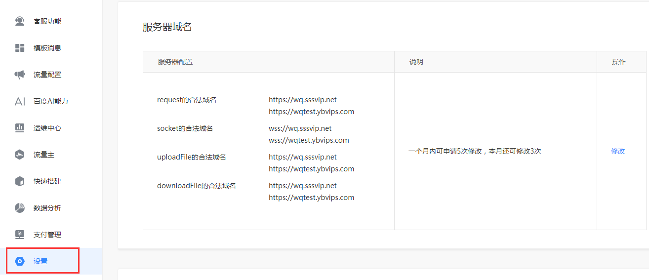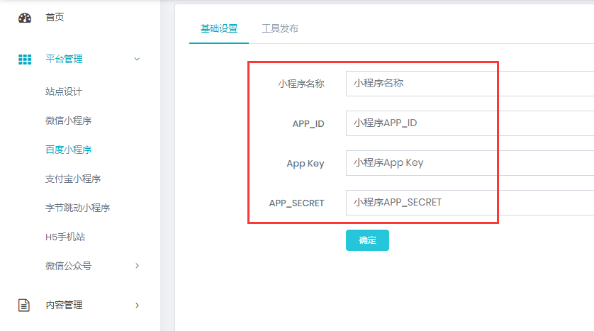 一、对接百度小程序,需要填写小程序名称、APP_ID、APP_KEY、APP_SECRET等信息  二、登录百度小程序后台,打开“设置”菜单的“开发设置”页面,可获取小程序的APP_ID、APP_KEY、APP_SECRET等信息,复制到后台即可  三、填写小程序服务器域名,同样是打开“设置”菜单的“开发设置”页面,页面向下拉可看到服务器域名相关的设置,填写站点域名即可(站点需配置SSL域名证书)