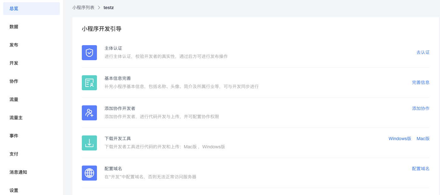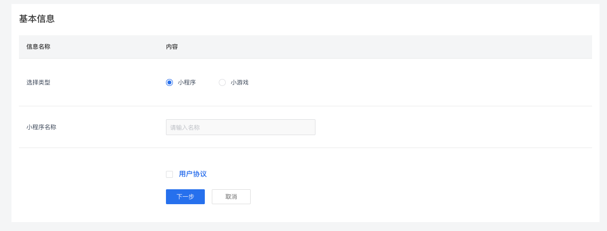 填写信息 进入开发者平台,登录帐号后,点击「进入开发者平台」,点击「创建一个小程序」。  点击创建小程序,即进入下图所示页面,按提示输入相关内容。  点击下一步之后需进行账号手机动态验证,验证成功即可进入小程序后台。  根据小程序开发引导,完整小程序对应的基础信息填写,请如实填写相关信息。 特别注意:基本信息中的分类请如实填写,将影响小程序的推荐精准度;小程序服务类型请如实填写,不同类型需上传不同的服务资格证明。