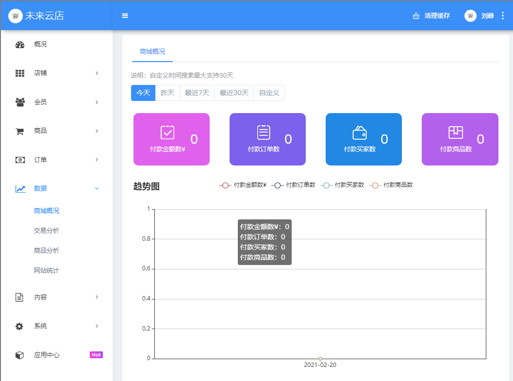 可以搜索查看今天、昨天、最近7天、最近30天以及自定义时间段的付款金额数、付款订单数、付款买家数、付款商品数趋势图