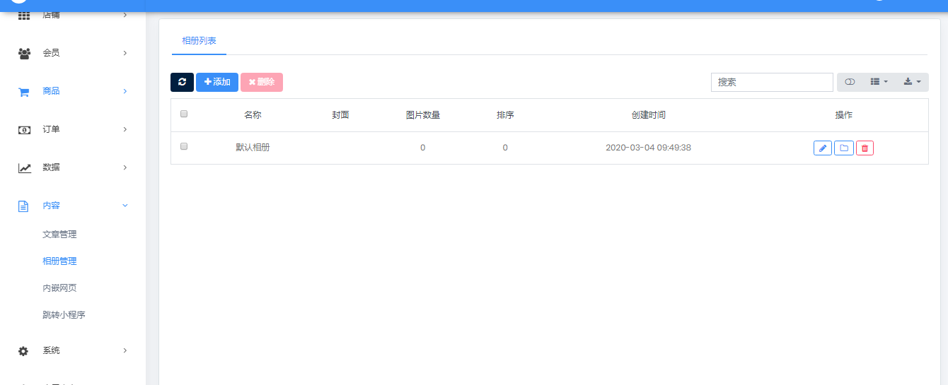 相册管理 可以创建、编辑、管理、删除相册,相册的主要作用在于方便商品图片的管理。 相册列表可查看已创建的相册名称、封面、图片数量、添加时间等,还可对相册进行改名、删除等操作。