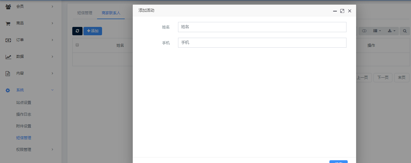 详见第三部分的【短信配置】-阿里云短信和腾讯云短信  短信管理-商家联系人,可以添加活动如姓名、手机。