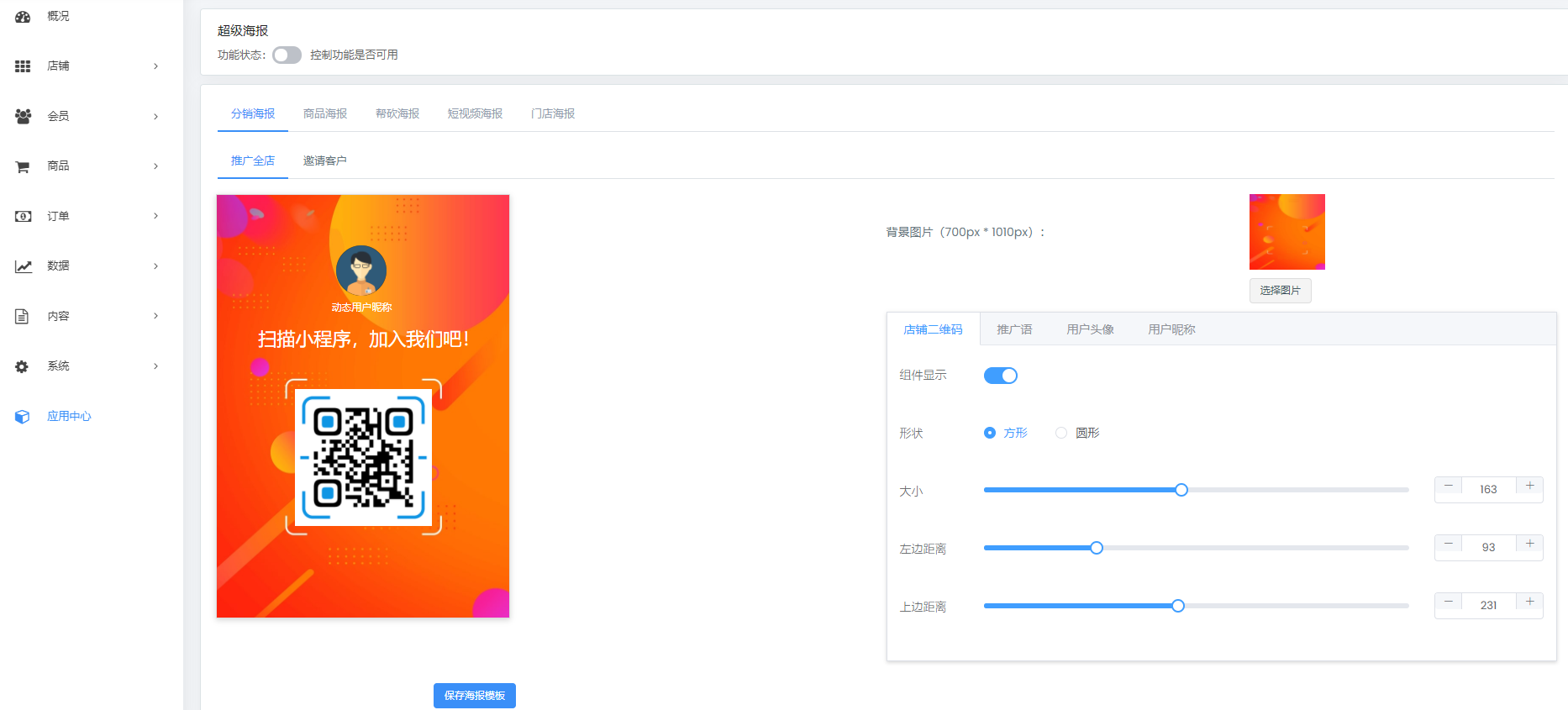 分销海报、商品海报、帮砍海报、门店海报支持自定义设计 注:如果开启超级海报按钮,必须设计后,才可以生成海报。如果没有开启使用的是默认海报