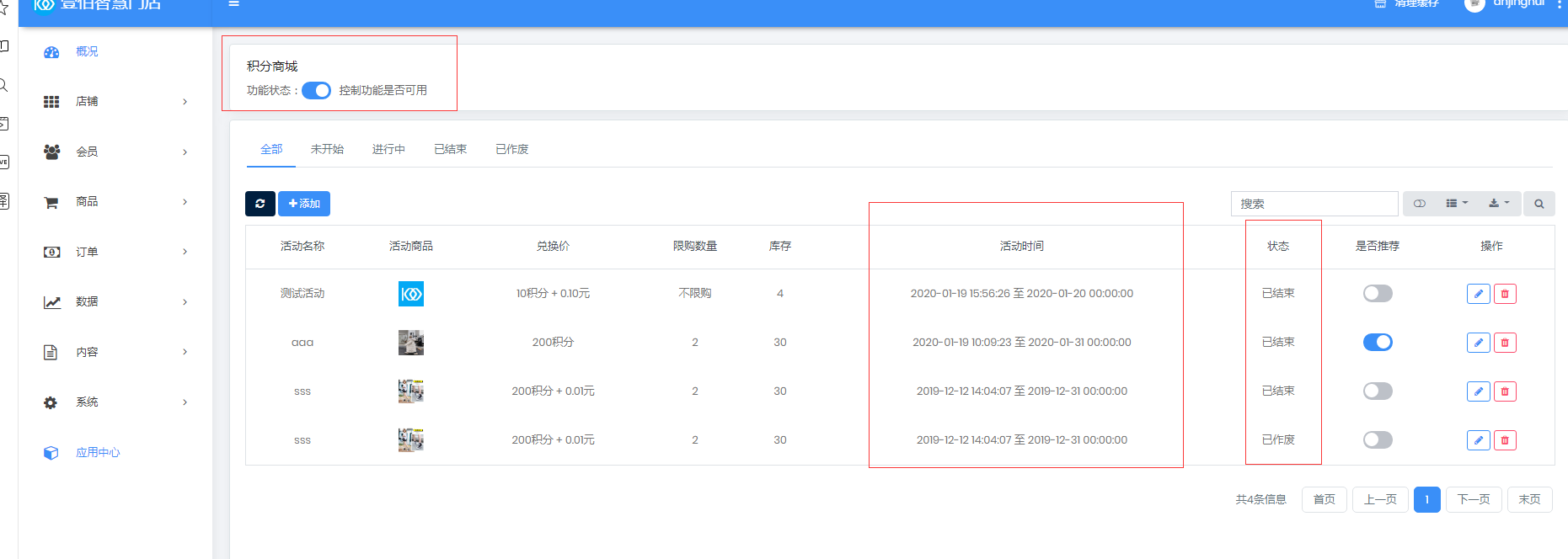 1、(获取积分后可以通过积分商城进行换购)可在此页面添加换购商品 2、添加积分活动商品时,应注意时间状态的设定  3、添加活动商品时可以纯积分换购和积分加现金的方式进行设置