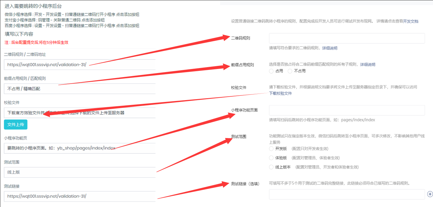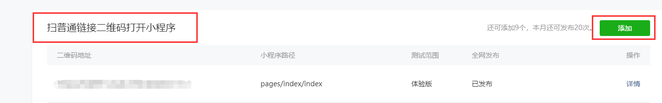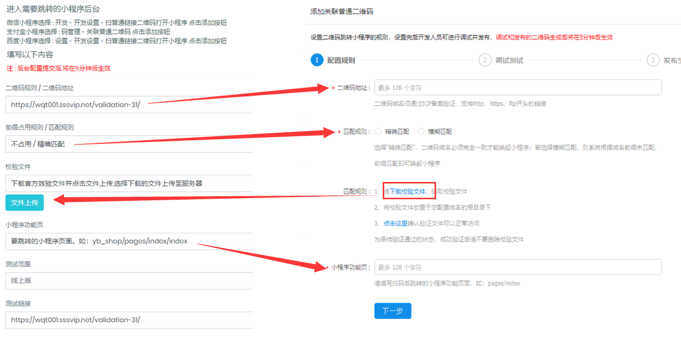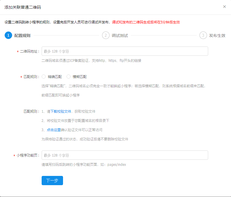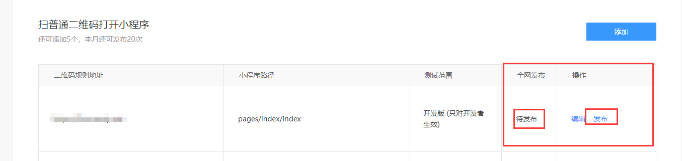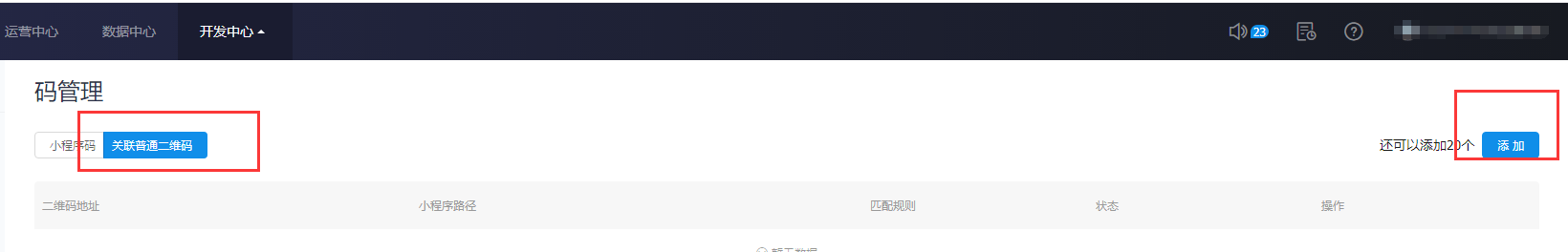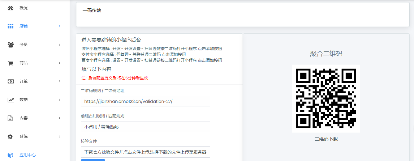 ## 9.4.1、一码多端 通过配置数据,使用户通过一个二维码进入多个小程序平台,方便商家推广  如何配置一码多端: 微信小程序: 第一步:选择“ 开发 ”  第二步:选择“ 开发设置 ”  第三步:找到“ 扫普通链接二维码打开小程序 ” 点击添加按钮  第四步:根据提示填写对应的相关信息。   百度小程序: 第一步:选择“ 设置 ”  第二步:选择“ 开发设置 ”  第三步:找到“ 扫普通链接二维码打开小程序 ” 点击添加按钮  第四步:根据提示填写对应的相关信息。   支付宝小程序: 第一步:选择 “ 码管理 ”。  第二步:点击 “ 关联普通二维码 ” ,点击“ 添加 ”。  第三步:根据提示填写对应的相关信息。   备注:效验规则,配置时需要先在对应的小程序后台下载,然后在轻站后台上传,上传仅需一次即可。  出现下图情况,需要点击发布,进行完成,完成后需等待五分钟后,才可以扫轻站后台二维码使用(每个小程序后台操作都需要查看下列问题)