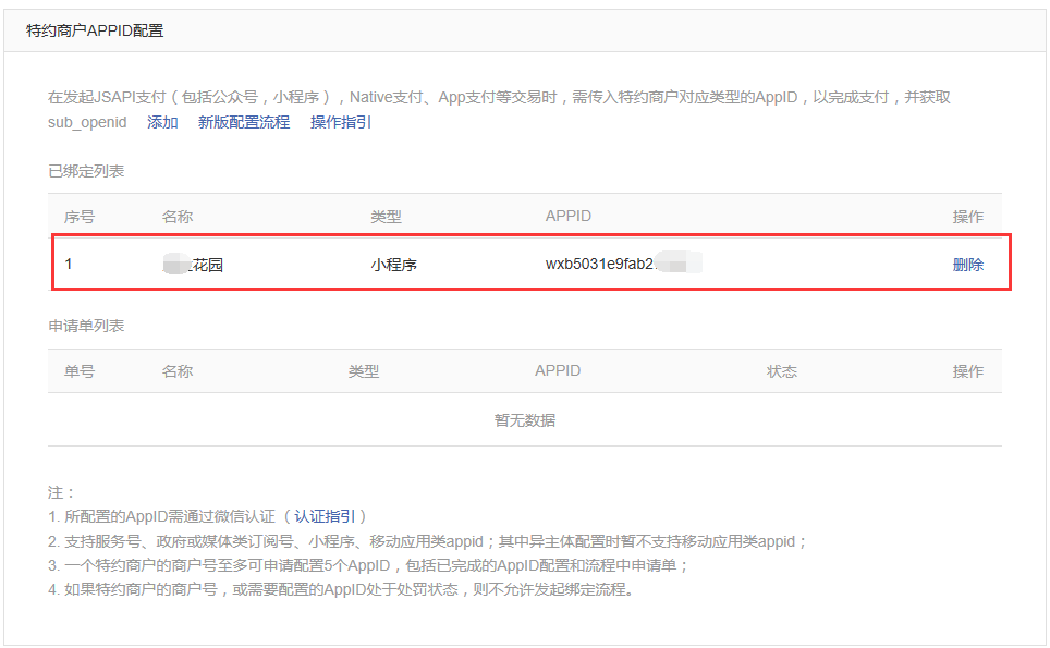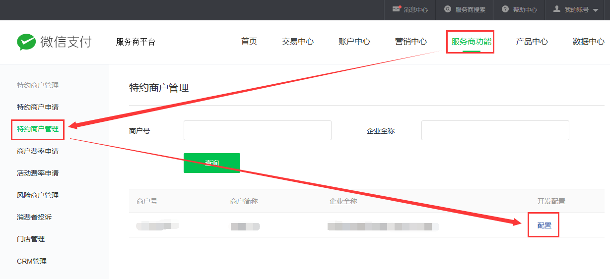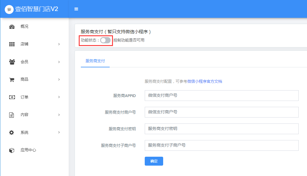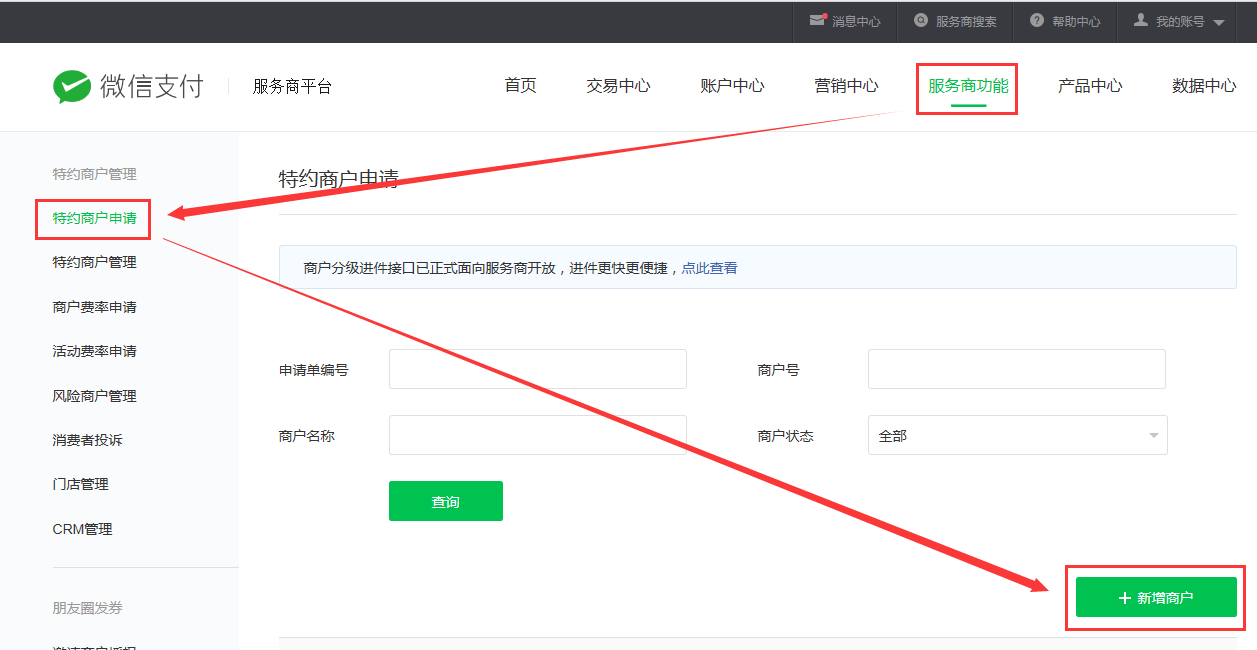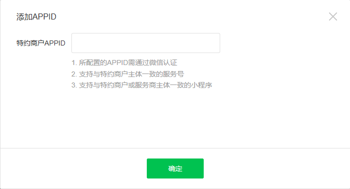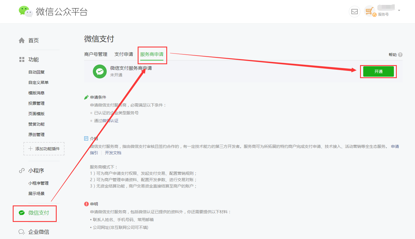 一、登录微信公众号平台,申请微信支付服务商(资料正确无误的话,1-2个工作日可通过) 未来云店后台服务商配置页面有需要填写公众号APPID,就是当前申请服务商支付的公众号(服务号)APPID。  二、登录微信支付客户平台(服务商账号),申请服务商子商户(资料正确无误的话,1-2个工作日可通过)  三、添加子商户需要绑定的小程序APPID   四、填写待绑定的小程序APPID或公众号APPID  APPID添加成功  五、登录未来云店后台,开启服务商支付,并填写相关的信息(须检查普通支付是否填写信息,如有填写,请清除)  六、如果需要实现退款功能,需下载服务商的证书文件,在未来云店后台配置一下退款信息 同时在子商户平台授权一下【服务商API退款】服务  七、微信支付服务商奖励政策解读  八、成为微信支付服务商的好处