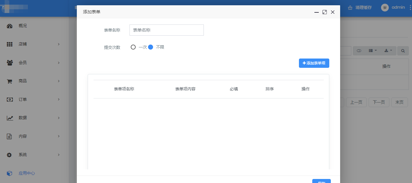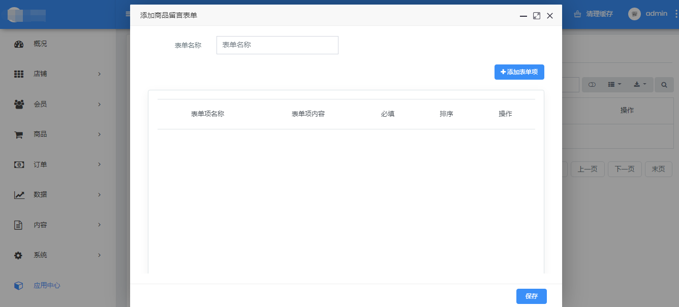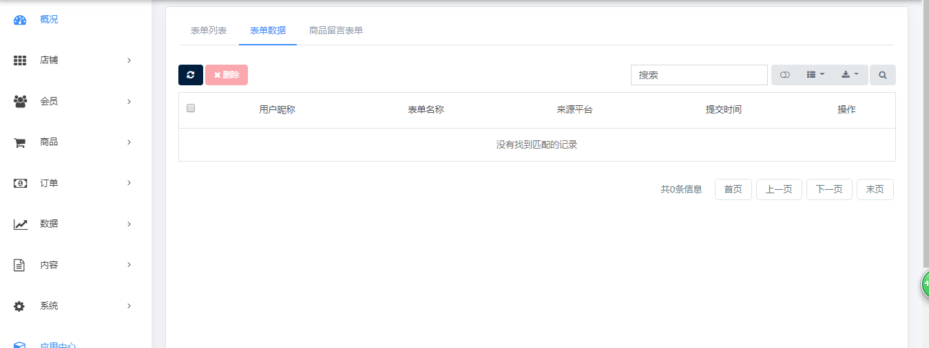 添加表单列表、表单名称、提交次数、添加表单项:名称、类型、提醒文字。  后台可以查看小程序端提交的表单数据、可以对表单数据进行删除,可以查看提交表单的用户昵称、表单名称、来源平台、提交时间、操作。  添加商品留言表单