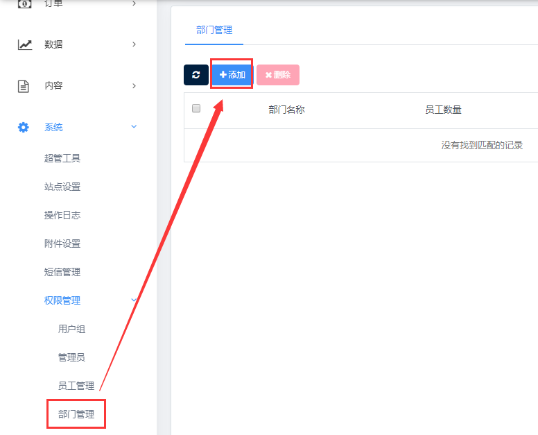 一、打开【系统】-【系统管理】-【权限管理】-【部门管理】页面,点击【添加】按钮  二、在弹出的窗口中填写部门名称,点击【确定】按钮即可