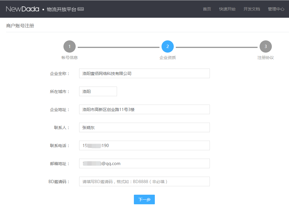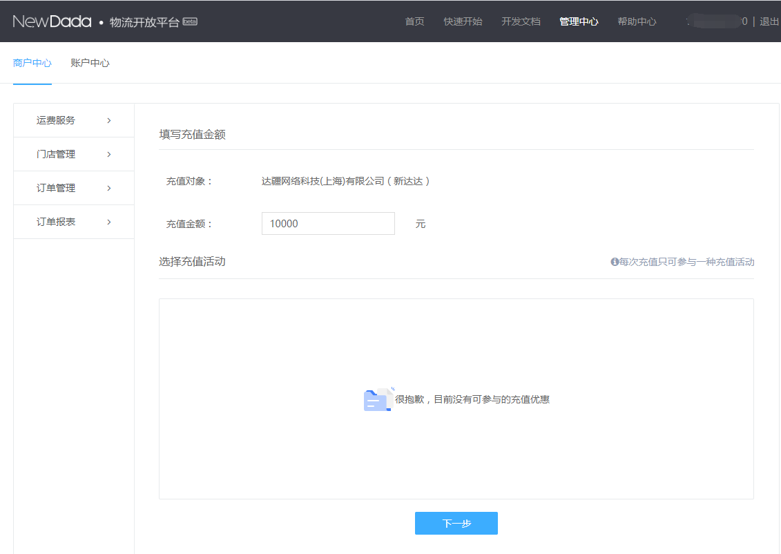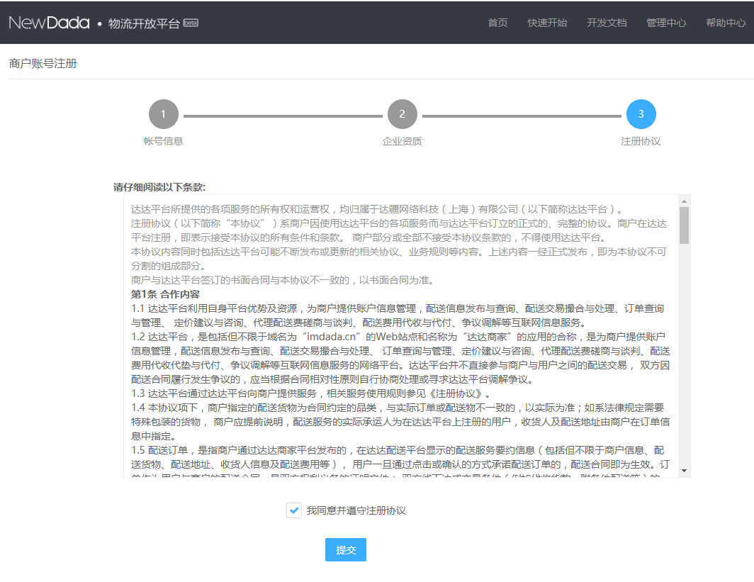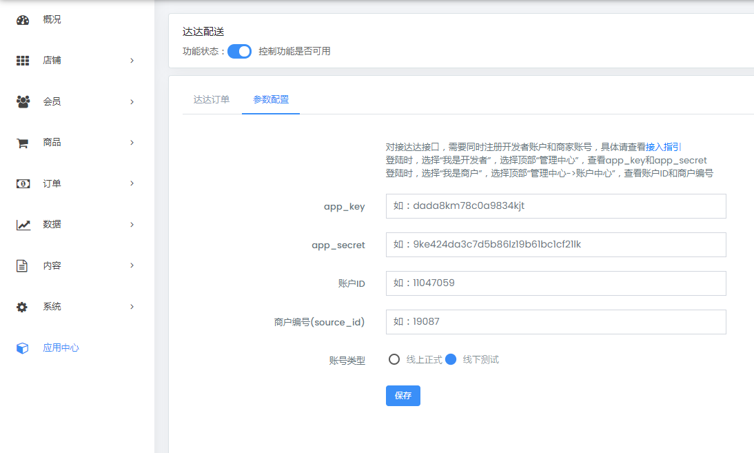 一、登录达达配送官方网站注册商户账号https://newopen.imdada.cn/#/merchantRegister?_k=hutxgk    二、登录【管理中心】,点击【基本资料】,获取商户编号和账户ID  三、在商户中心进行充值操作   三、登录达达配送官方网站注册开发者https://newopen.imdada.cn/#/register?_k=ss2oen  四、获取开发者的app_key和app_secret  五、打开商户后台的账号中心-商户绑定页面,新建绑定,绑定申请好的商户号   六、登录开发者平台的账户中心,点击【开发者绑定】,对商家账号发起的申请进行【通过】操作  七、登录未来云店后台【应用中心-工具-达达配送】,开启达达配送,并填写相关的配置信息   八、管理员在订单详情可查看物流信息,用户在小程序端订单列表可查询物流信息  小程序端: